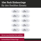 Die schwenkbaren Einbauleuchtenringe im 10er-Set in Weiß aus Kunststoff sind eine ideale Lösung für eine flexible Beleuchtung. Der unauffällige Sprengring passt perfekt zur Leuchte und sorgt für eine harmonische Optik. Passend für Leuchtmittel mit 50mm Durchmesser, bspw. GU10 oder Paulmann LED-Coins.