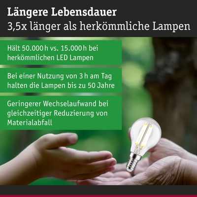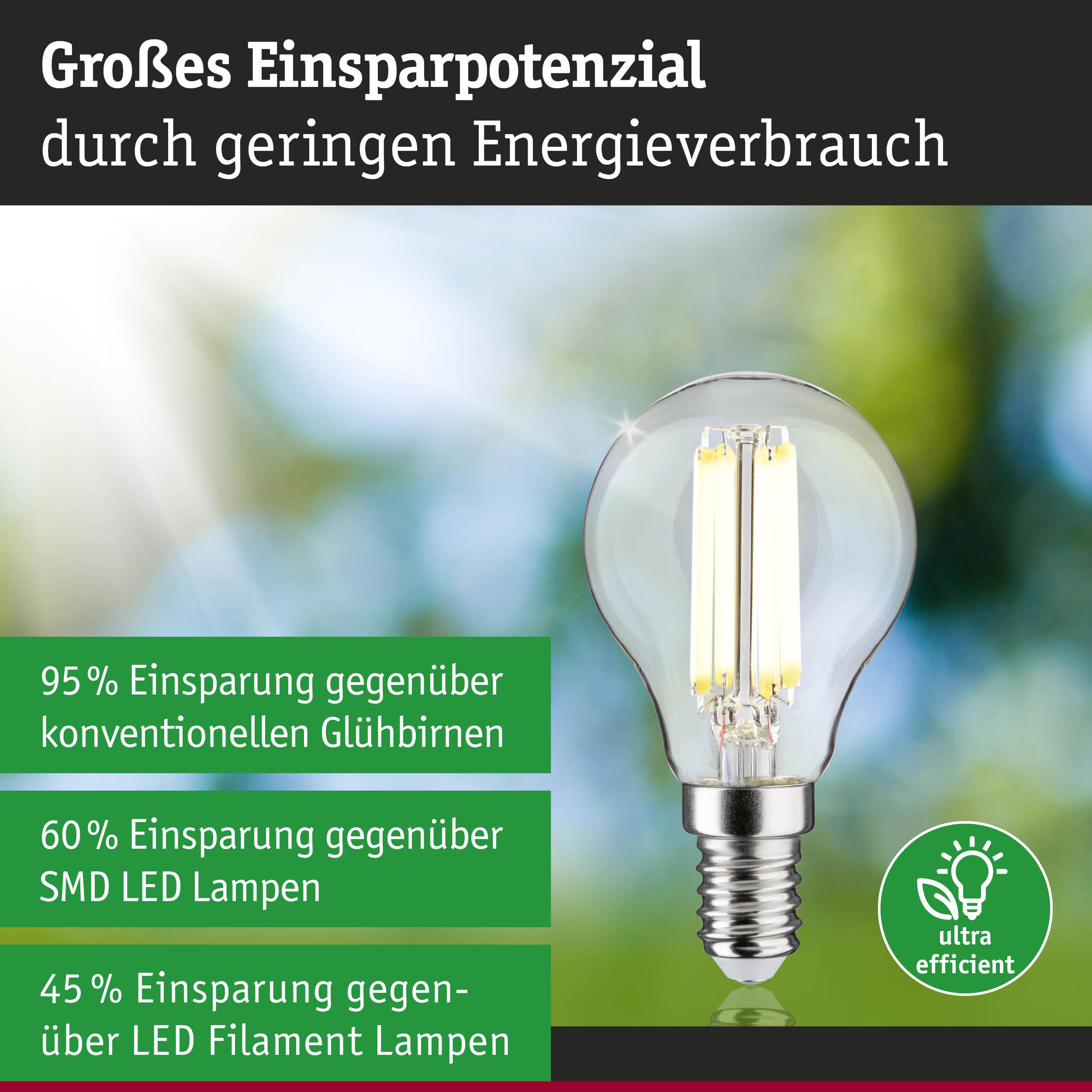 Die ultra-effizienten Leuchtmittel der Eco-Line verbinden Innovation mit Nachhaltigkeit. Durch den 60 % niedrigeren Energieverbrauch und der deutlich längeren Lebensdauer gegenüber Standard LED-Lampen lassen sich die Energiekosten deutlich senken und ganz nebenbei noch die Umwelt schonen. Die klare Filament Tropfenlampe mit 4000K, einer Leistung von 2,5W und 525lm schafft ein angenehm gleichmäßiges Licht ohne Grünstich. Die Lampe passt in jede handelsübliche E14 Fassung. Tropfenlampen eignen sich dank ihrer kompakten Bauform ideal für den Einsatz in kleinen Leuchten.
