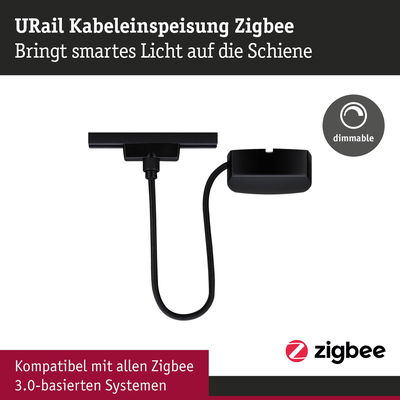 Diese 230 Volt Kabeleinspeisung in Schwarz matt mit integriertem Zigbee 3.0-Steuergerät schaltet oder dimmt das gesamte URail System. Die Einspeisung bietet hohe Flexibilität, da das Schienensystem nicht zwingend entlang der Einspeisungsstelle verlaufen muss. Das Kabel kann an beliebiger Stelle in die Schiene integriert werden. Diese Kabeleinspeisung ist eine von zahlreichen Systemteilen aus der URail Serie. Zusammen mit weiteren Komponenten lässt sich ein persönliches 230 Volt URail Schienensystem gestalten. HINWEIS: Dieser Artikel ist nicht mit allen festverbauten LEDs und LED-Leuchtmitteln kompatibel und funktioniert nur in Verbindung mit stufenlos dimmbaren Leuchten. Die Dimmer-Kompatibilität kann aus den technischen Daten der Leuchten/Leuchtmittel entnommen werden.