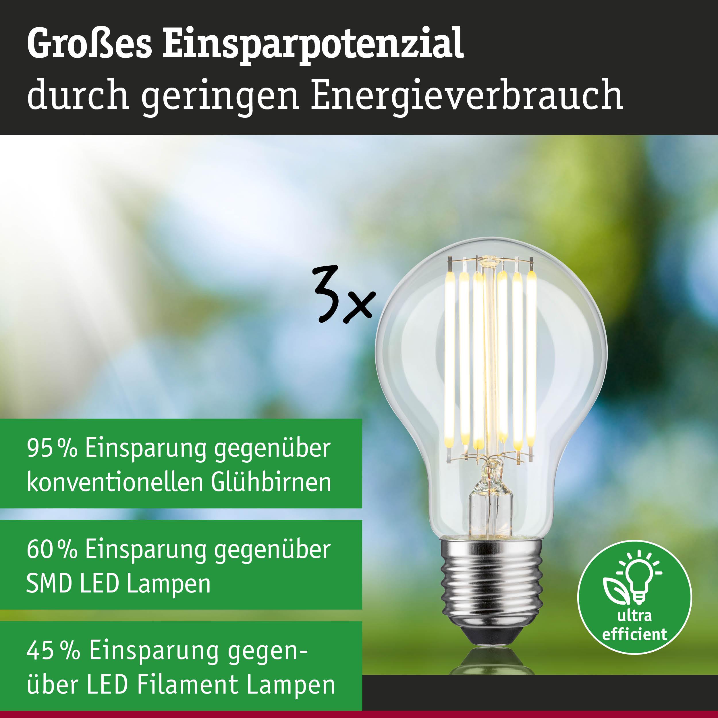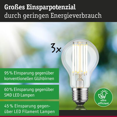 Die ultra-effizienten Leuchtmittel der Eco-Line verbinden Innovation mit Nachhaltigkeit. Durch den 60 % niedrigeren Energieverbrauch und der deutlich längeren Lebensdauer gegenüber Standard LED-Lampen lassen sich die Energiekosten deutlich senken und ganz nebenbei noch die Umwelt schonen. Die Filament LED Birne mit 3000K, einer Leistung von 5W und 1055lm schafft ein angenehm gleichmäßiges Licht ohne Grünstich. Die Lampe passt in jede handelsübliche E27 Fassung. Selbst große Lampenschirme werden gleichmäßig ausgeleuchtet. Die Paulmann LED-Lampen mit Eye friendly-Siegel bieten augenschonendes und komfortables Licht. Ob beim Arbeiten, Lesen oder Entspannen, die Lampen tragen zu besten Sehkomfort bei.