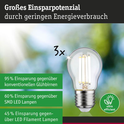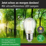Die ultra-effizienten LED-Leuchtmittel der Eco-Line verbinden innovative Technik mit Nachhaltigkeit und sorgen für eine effiziente und stilvolle Beleuchtung. Dank des 60 % niedrigeren Energieverbrauchs und der deutlich längeren Lebensdauer gegenüber Standard LED-Lampen, lassen sich die Energiekosten erheblich senken und ganz nebenbei noch die Umwelt schonen. Die klaren Filament-Tropfenlampen passen in jede handelsübliche E27 Fassung und schaffen mit 3000K, einer Leistung von 3x2,5W und 3x525lm ein angenehm warmweißes Licht ohne Grünstich. Dadurch verwandeln die tropfenförmigen Leuchtmittel jeden Raum in ein harmonisches Wohlfühlambiente. Tropfenlampen eignen sich dank ihrer kompakten Bauform ideal für den Einsatz in kleinen Leuchten. Das praktische Mehrfachset macht es möglich, direkt mehrere Leuchten zu bestücken, um einen ganzen Raum zum Strahlen zu bringen. Die Paulmann LED-Lampen mit Eye friendly-Siegel bieten augenschonendes und komfortables Licht. Ob beim Arbeiten, Lesen oder Entspannen, die Lampen tragen zu bestem Sehkomfort bei.