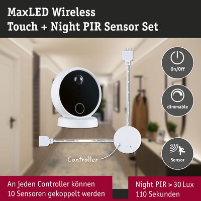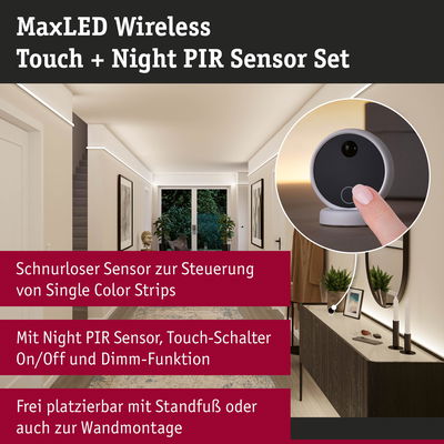 Das hochwertige Wireless PIR & Touch Sensor Set inklusive Receiver zur Steuerung der MaxLED Strips bietet die perfekte Kombination aus Qualität, Design und Funktionalität. Mit dem ansprechenden schwarz, weißem Design und der kabellosen Konstruktion, fügen sich die Wireless Sensoren harmonisch in jedes Wohnkonzept ein. Dank der klebbaren Wandhalterung kann der Sender mühelos an der Wand angebracht und je nach Wunsch in der Magnethalterung positioniert werden. Für die richtige Lichtstimmung dient der eingebaute Dimmer, während der Bewegungsmelder inkl. Dämmerungssensor für maximalen Komfort und Sicherheit sorgt. Die Wireless Sensoren überzeugen außerdem mit dem kinderleichten Pairing über den separaten „Pairing Button“. Zur individuellen Lichtsteuerung können an jeden Empfänger bis zu 10 Sensoren gekoppelt werden. Dank der effizienten Technik hält eine Batterieladung von 100 % ein ganzes Jahr, während die Lebensdauer 5000 Trigger beträgt.