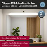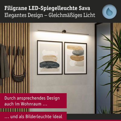 Die Spiegeltubeleuchte Sava in Schwarz matt ist nicht nur funktionell, sondern auch optisch mit ihrem modernen, filigranen Look ein absolutes Highlight. Durch den hohen IP-Schutz von IP 44 ist die Leuchte vor Spritzwasser geschützt und eignet sich besonders im Badezimmer oder anderen Feuchträumen. Sie überzeugt nicht nur mit ihrer schlichten Eleganz, sondern auch durch ihre vielseitigen Einsatzmöglichkeiten: Ob im Badezimmer, im Flur oder als stilvolle Bilderleuchte – sie fügt sich harmonisch in jede Umgebung ein. Das satinierte, durchgängige LED-Leuchtband mit außenliegendem Diffusor sorgt mit 3000K für eine angenehme und blendfreie Lichtverteilung und leuchtet den Bereich um den Spiegel perfekt aus. Mit einer Breite von 1200x72mm kann sie perfekt als Spiegel- oder Bildbeleuchtung verwendet werden. Dank ihrer langen Lebensdauer von bis zu 50.000 h und der hochwertigen Verarbeitung von Metall und Acryl steht sie für besonders hohe Qualität. Besonders im Spiegelbereich beeindruckt sie mit ihrer hohen Farbwiedergabe.