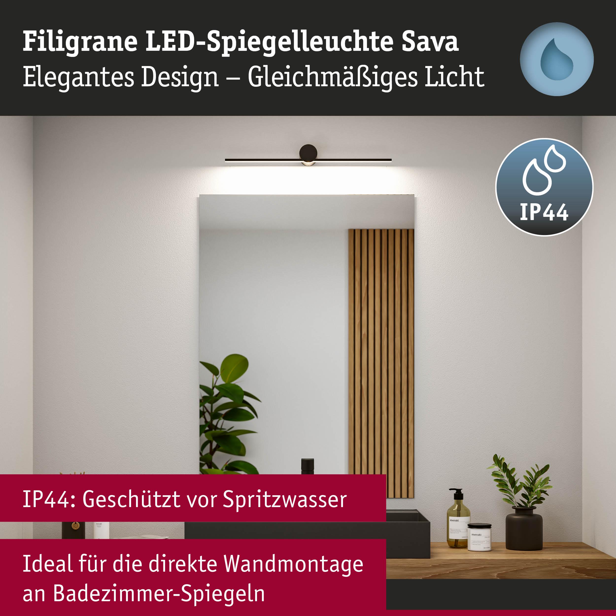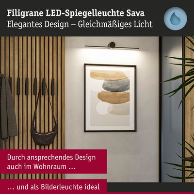 Die Spiegeltubeleuchte Sava in Schwarz matt ist nicht nur funktionell, sondern auch optisch mit ihrem modernen, filigranen Look ein absolutes Highlight. Durch den hohen IP-Schutz von IP 44 ist die Leuchte vor Spritzwasser geschützt und eignet sich besonders im Badezimmer oder anderen Feuchträumen. Sie überzeugt nicht nur mit ihrer schlichten Eleganz, sondern auch durch ihre vielseitigen Einsatzmöglichkeiten: Ob im Badezimmer, im Flur oder als stilvolle Bilderleuchte – sie fügt sich harmonisch in jede Umgebung ein. Das satinierte, durchgängige LED-Leuchtband mit außenliegendem Diffusor sorgt mit 3000K für eine angenehme und blendfreie Lichtverteilung und leuchtet den Bereich um den Spiegel perfekt aus. Mit einer Breite von nur 600x72mm kann sie perfekt auf schmale Spiegel- oder Bildergrößen abgestimmt werden. Dank ihrer langen Lebensdauer von bis zu 50.000 h und der hochwertigen Verarbeitung von Metall und Acryl steht sie für besonders hohe Qualität. Besonders im Spiegelbereich beeindruckt sie mit ihrer hohen Farbwiedergabe.