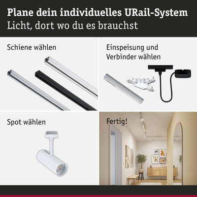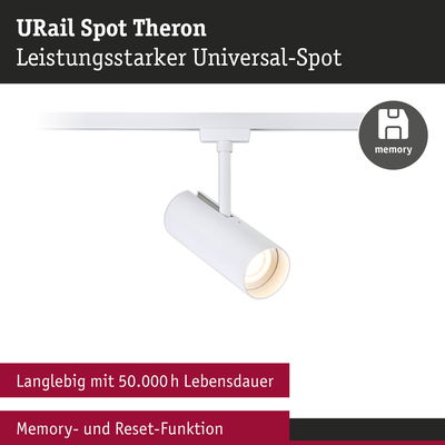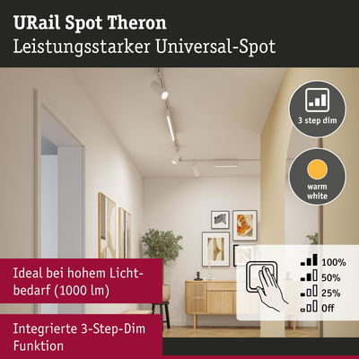 Der warmweiße Schienenspot Theron in Signalweiß ist besonders energieeffizient und schafft mit einer Leistung von über 1000lm eine sehr helle Ausleuchtung. Die hohe Farbwiedergabe von CRI ≥ 90 sorgt dabei für natürliche und kräftige Farben. Das Licht kann flexibel ausgerichtet werden, da der röhrenförmige Spot schwenkbar ist. Über einen handelsüblichen Lichtschalter kann die Helligkeit auf 100%, 50% und 25% eingestellt werden - so kann die individuelle Lichtinszenierung flexibel an jede Situation angepasst werden. Dank integrierter Memoryfunktion wird beim erneuten Einschalten die zuletzt gewählte Dimmstufe aktiviert. Mit einer langen Lebensdauer von 50.000 h sorgt der LED Spot für eine langfristige Nutzung. Zusammen mit den entsprechenden URail Komponenten entsteht ein ganz individuelles Lichtsystem bis zu einer Gesamtleistung von max.1000W.