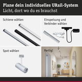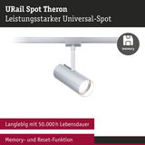 Der neutralweiße URail Schienenspot Theron in Chrom matt ist besonders energieeffizient und schafft mit einer Leistung von über 1000lm eine sehr helle Ausleuchtung. Die hohe Farbwiedergabe von CRI ≥ 90 sorgt dabei für natürliche und kräftige Farben. Das Licht kann flexibel ausgerichtet werden, da der röhrenförmige Spot schwenkbar ist. Über einen handelsüblichen Lichtschalter kann die Helligkeit auf 100%, 50% und 25% eingestellt werden - so kann die individuelle Lichtinszenierung flexibel an jede Situation angepasst werden. Dank integrierter Memoryfunktion wird beim erneuten Einschalten die zuletzt gewählte Dimmstufe aktiviert. Mit einer langen Lebensdauer von 50.000 h sorgt der LED Spot für eine langfristige Nutzung. Zusammen mit den entsprechenden URail Komponenten entsteht ein ganz individuelles Lichtsystem bis zu einer Gesamtleistung von max.1000W.