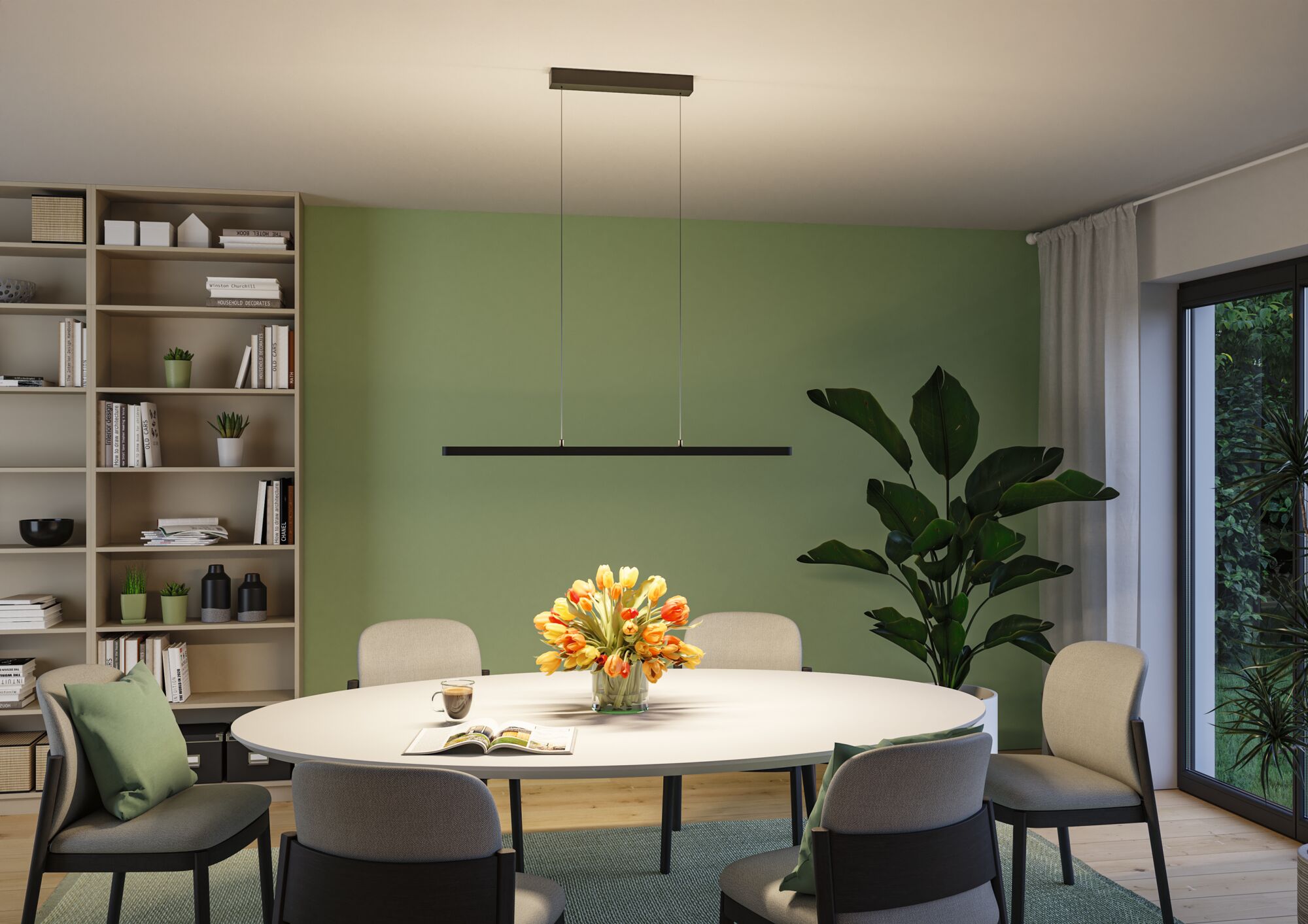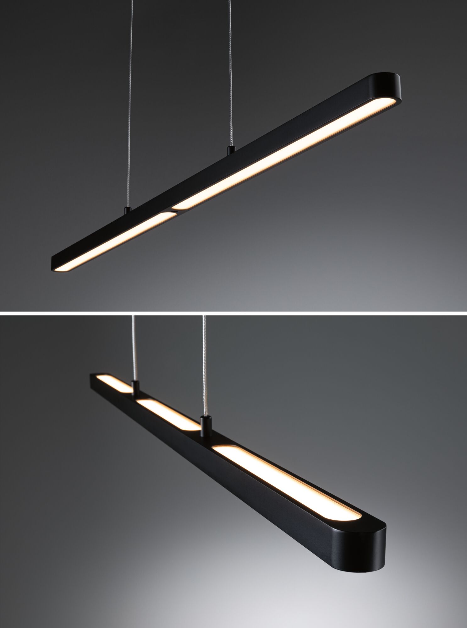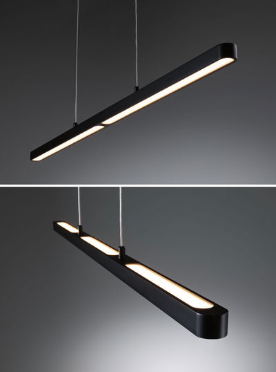Die Pendelleuchte Mailo eignet sich ideal für die Beleuchtung an Esstischen, Küchenzeilen oder am Arbeitsplatz. Mit ihrem zeitlosen und zugleich modernen Design in schwarz matt fügt sie sich nahtlos in unterschiedlichste Wohnstile ein. Dank einer Farbtemperatur von 2700K schafft sie ein warmweißes, gemütliches Licht, das durch den satinierten Diffusor blendfrei ist. Bei einer Leistung von 3450lm sorgt sie für eine besonders helle Ausleuchtung. Nach Bedarf lässt sich die Helligkeit stufenlos dimmen, sodass jederzeit die optimale Lichtstimmung geschaffen werden kann. Die integrierte Memoryfunktion speichert dabei die zuletzt gewählten Lichteinstellungen bis zum nächsten Einschalten. Dank des integrierten Näherungssensors unterhalb des Diffusors, gestaltet sich das Schalten und Dimmen einfach und bequem per Handsteuerung. Die Pendellänge lässt sich einfach und ohne Werkzeug an dem filigranen Kabel beliebig anpassen.