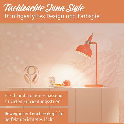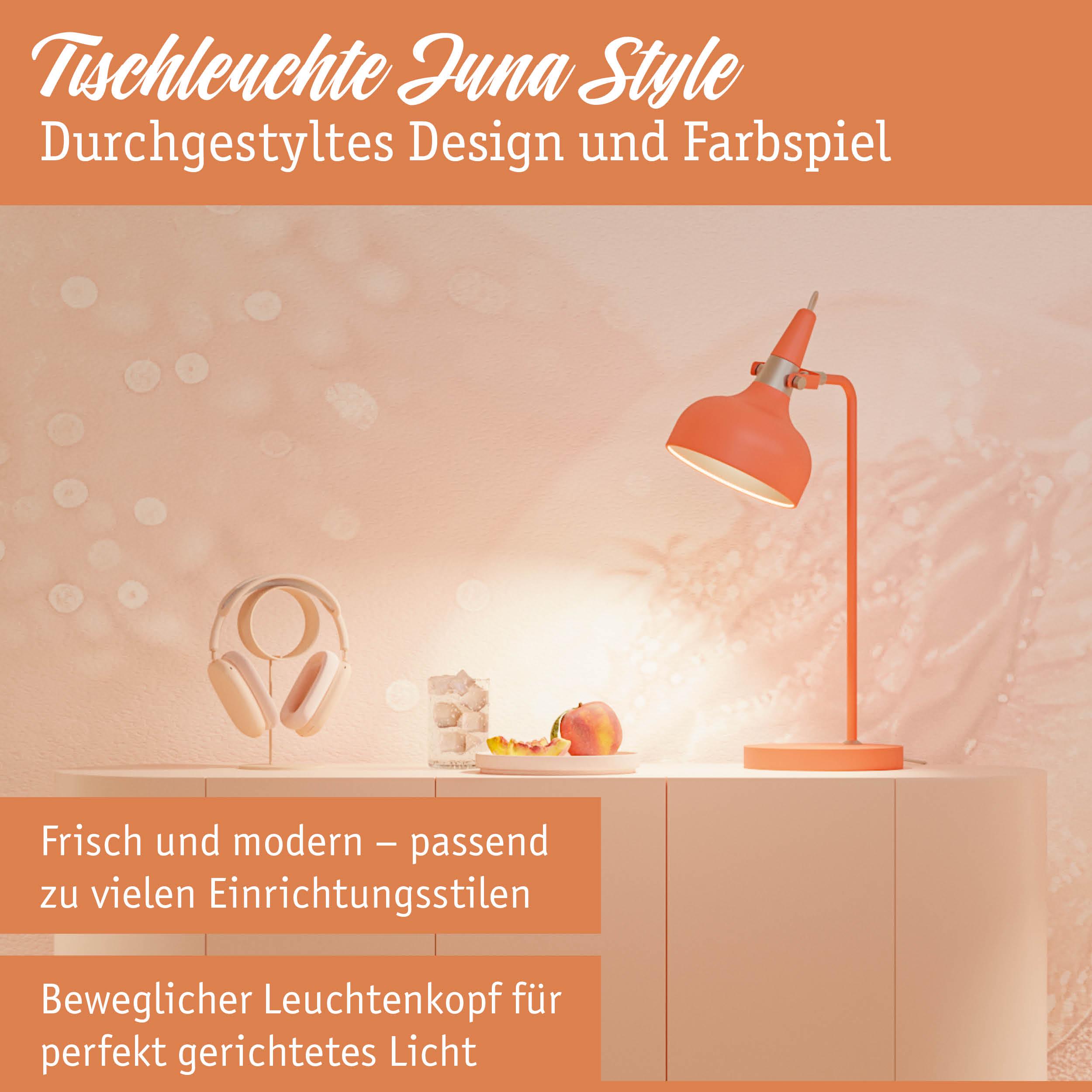 Mit ihrer modernen Form- und Designsprache setzen die Juna Style Leuchten attraktive Lichtakzente im Wohnbereich. Nach Belieben lassen sich die aufeinander abgestimmten Tisch- Steh- und Pendelleuchten der Serie harmonisch miteinander kombinieren. Ob auf dem Nachttisch, als Schreibtischleuchte oder als dekoratives Designelement auf dem Sideboard – in ihrem farbenfrohen Peach wird die Tischleuchte zum echten Hingucker. Ihre hochwertige Verarbeitung sorgt nicht nur für eine ansprechende Optik, sondern auch für eine lange Lebensdauer. Der bewegliche Leuchtenkopf ermöglicht eine flexible Ausrichtung des Lichts, während das Textilkabel mit Kabelschalter eine bequeme und sichere Nutzung sicherstellt. Als Leuchtmittelempfehlung eignen sich insbesondere dekorative Kopfspiegellampen mit einem E14-Sockel, die für ein blendfreies Licht sorgen.
