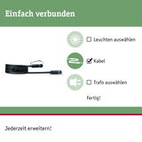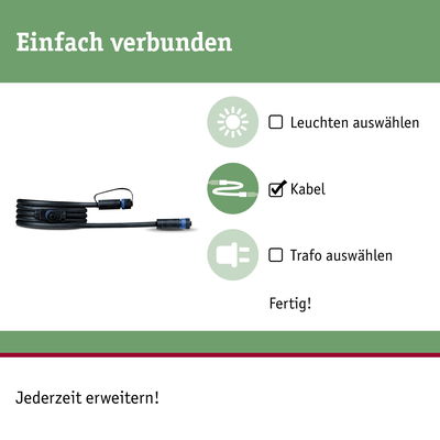 Das Plug & Shine Verbindungskabel überbrückt Entfernungen bis zwei Meter und ermöglicht den Anschluss von zwei weiteren Leuchten oder weiterem Zubehör. Nicht benötigte Abgänge können mit den mitgelieferten Abdeckkappen verschlossen werden, um den IP68-Tauchwasserschutz zu gewährleisten. In Kombination mit Leuchten und Trafos aus der Plug & Shine Serie können Außenbereiche ganz nach eigenen Wünschen beleuchtet werden: von der Hauswand über die Terrasse bis hin zu Gartenwegen und Pflanzen.