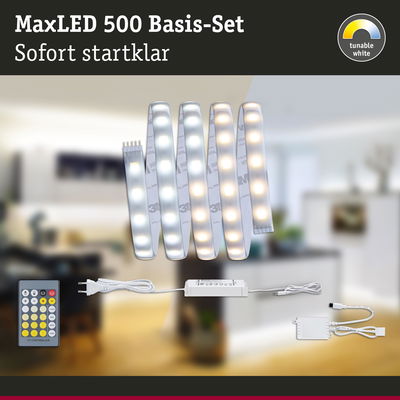 MaxLED-Strips 500 sind mit 10W und 550lm/m so leistungsstark, dass sie problemlos zur Raumausleuchtung eingesetzt werden können. Besonders in Profilen sind sie echte Highlights. Dank der intelligenten Weißlichtsteuerung Tunable White lässt sich die Lichtfarbe der Strips individuell variieren - von tageslichweißem Arbeitslicht bis hin zu warmweißer Entspannungsbeleuchtung ist alles möglich. Das Basisset enthält neben dem Streifen mit einer Länge von 1,5m ein passendes Vorschaltgerät und eine Steuerungseinheit mit Infrarotfernbedienung. Es lässt sich nach Bedarf mit zusätzlichen Strips und Verbindern erweitern. Bei der Planung darf die unten angegebene Maximallänge nicht überschritten werden. Mit IP44-Schutz ist der Strip speziell gegen das Eindringen von Spritzwasser und deshalb ideal für den Einsatz in Feuchträumen geeignet.
