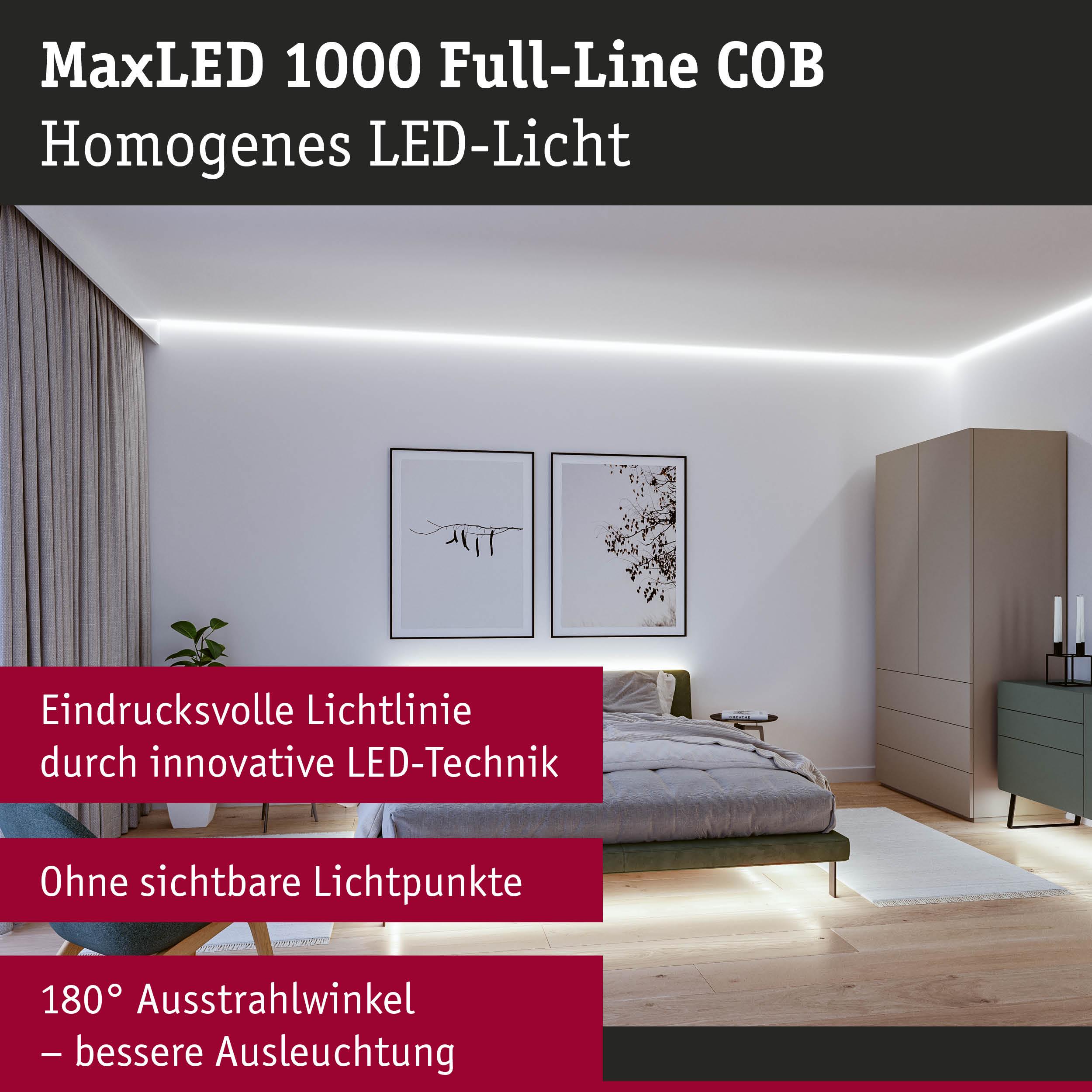 Ob Küchenarbeitsplatz, Werkstatt oder andere Arbeitsflächen – die MaxLED 500 Full-Line COB Strips eignen sich hervorragend als blendfreies Arbeitslicht. Der MaxLED 500 COB Einzelstrip mit 30W, einer Länge von 2,5m und 528 LED´s/m erzeugt ein absolut homogenes Lichtbild ohne sichtbare Lichtpunkte. Der tageslichtweiße Einzelstrip dient als Erweiterung zum MaxLED 500 COB Basisset und enthält neben dem Streifen, einen Lichtverbinder. Durch den Lichtverbinder ist ein nahtloses Verbinden möglich und führt das lineare Lichtbild ohne Unterbrechung fort. Der Strip ist mit 10 mm besonders schmal und passt damit auch in sehr filigrane LED Profile. Der breite Ausstrahlwinkel von 180° verteilt das Licht optimal ohne Schattenbildung. Die durchgängige Beschichtung schützt die LEDs vor Staub und Feuchtigkeit, die Kontaktstellen haben IP20.