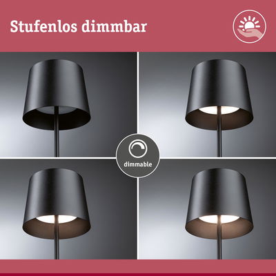 Die mobile LED Akkutischleuchte Gilo mit IP44 in Schwarz matt mit ihren Abmessungen von 105 x 350 mm ist kompakt und handlich. Sie benötigt keinen Stromanschluss und kann individuell sowohl drinnen als auch draußen genutzt werden kann. Egal ob beim Camping, auf der Terrasse oder dem Balkon, im Restaurant oder im Wohnzimmer – die Akkutischleuchte ist überall einsetzbar. Ihr reduziertes, zeitloses Design ermöglicht eine universelle und flexible Nutzung. Zudem schafft sie eine angenehme warmweiße Lichtstimmung und überzeugt durch hochwertiges Material und Verarbeitung, was zu einer langen Lebensdauer führt. Die kurze Ladezeit von 5 bis 6 Stunden ermöglicht eine lange Leuchtdauer von bis zu 10 Stunden bei voller Helligkeit (100 %). Die Akkutischleuchte kann über den USB-C Anschluss aufgeladen werden und verfügt über eine stufenlose Touch-Dimmfunktion.