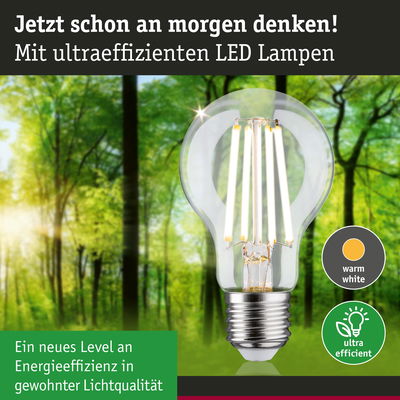 Die ultra-effizienten Leuchtmittel der Eco-Line verbinden Innovation mit Nachhaltigkeit. Durch den 60 % niedrigeren Energieverbrauch und der deutlich längeren Lebensdauer gegenüber Standard LED-Lampen lassen sich die Energiekosten deutlich senken und ganz nebenbei noch die Umwelt schonen. Die Filament LED Birne mit 3000K, einer Leistung von 4W und 840lm schafft ein angenehm gleichmäßiges Licht ohne Grünstich. Die Lampe passt in jede handelsübliche E27 Fassung. Selbst große Lampenschirme werden gleichmäßig ausgeleuchtet. Die Paulmann LED-Lampen mit Eye friendly-Siegel bieten augenschonendes und komfortables Licht. Ob beim Arbeiten, Lesen oder Entspannen, die Lampen tragen zu besten Sehkomfort bei.