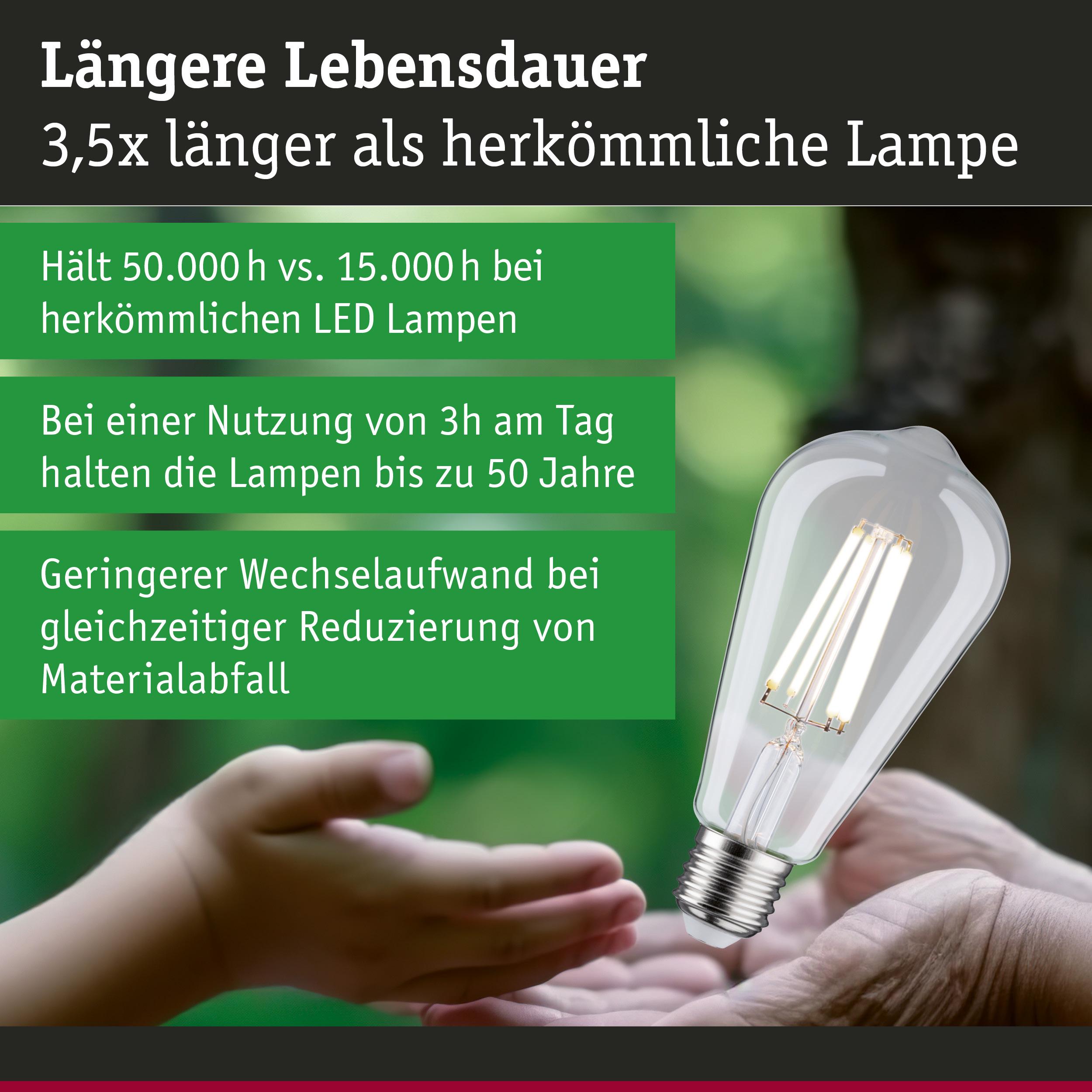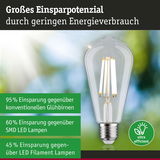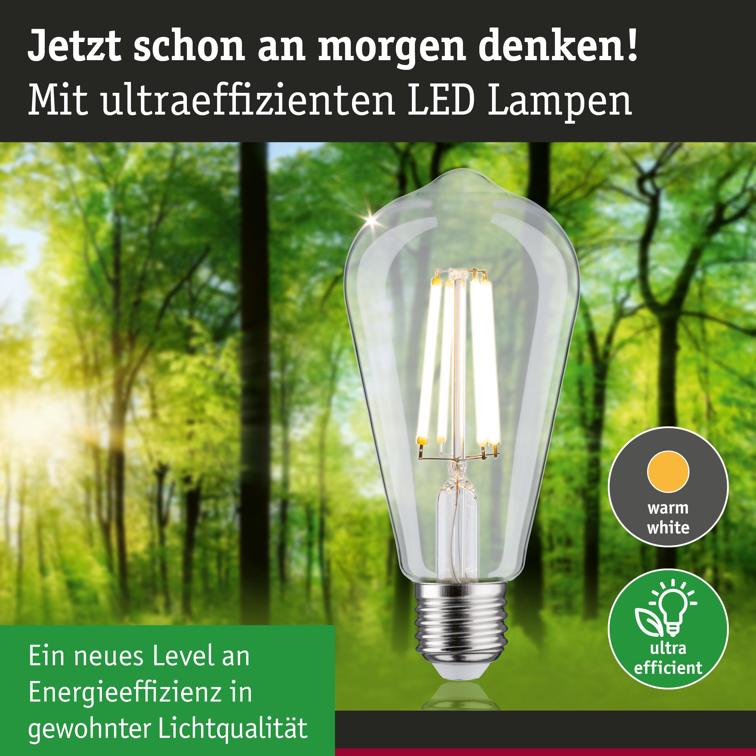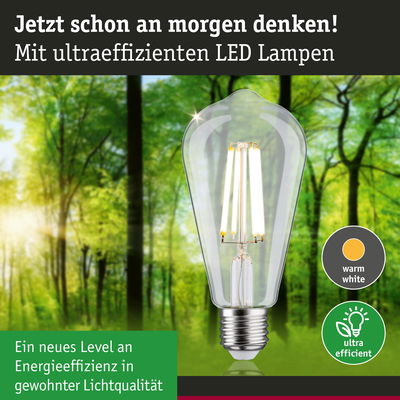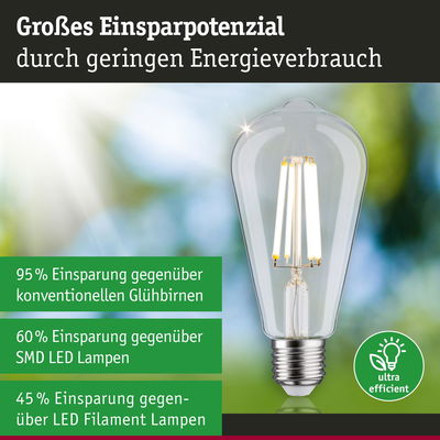 Die ultra-effizienten Leuchtmittel der Eco-Line verbinden Innovation mit Nachhaltigkeit. Durch den 60 % niedrigeren Energieverbrauch und der deutlich längeren Lebensdauer gegenüber Standard LED-Lampen lassen sich die Energiekosten deutlich senken und ganz nebenbei noch die Umwelt schonen. Die klare Filament Kolbenlampe mit 4000K, einer Leistung von 4W und 840lm gibt ihr Licht ohne Grünstich in alle Richtungen ab. Kolbenlampen sorgen für das perfekte Vintage-Gefühl und sind echte Hingucker in Retro-Pendeln. Sie hat eine neutralweiße Lichtfarbe und passt in jede handelsübliche E27-Fassung. Die Paulmann LED-Lampen mit Eye friendly-Siegel bieten augenschonendes und komfortables Licht. Ob beim Arbeiten, Lesen oder Entspannen, die Lampen tragen zu besten Sehkomfort bei.