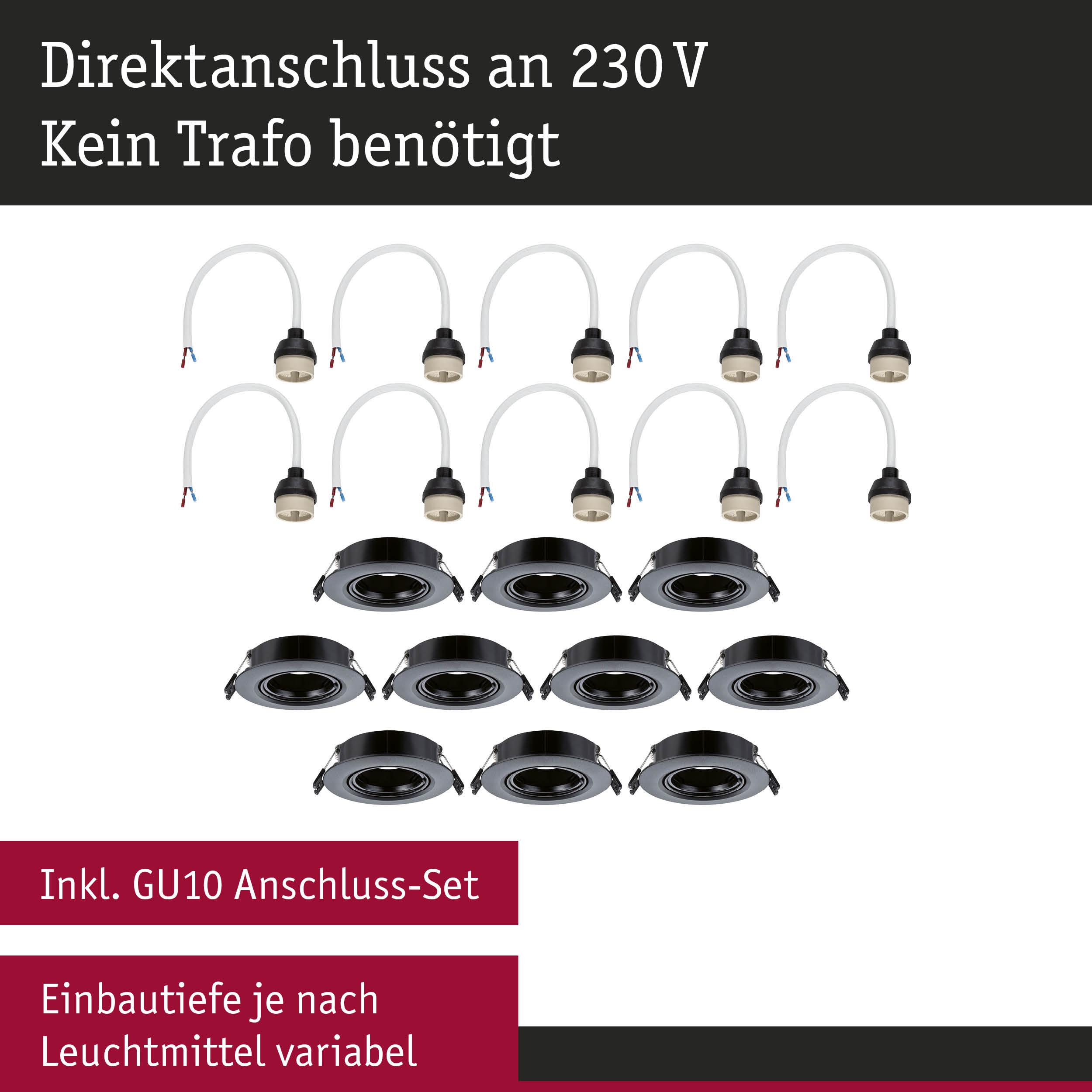 Einbauleuchte 10er-Set schwenkbar rund 90mm 30° GU10 max. 10x10W 230V dimmbar Schwarz