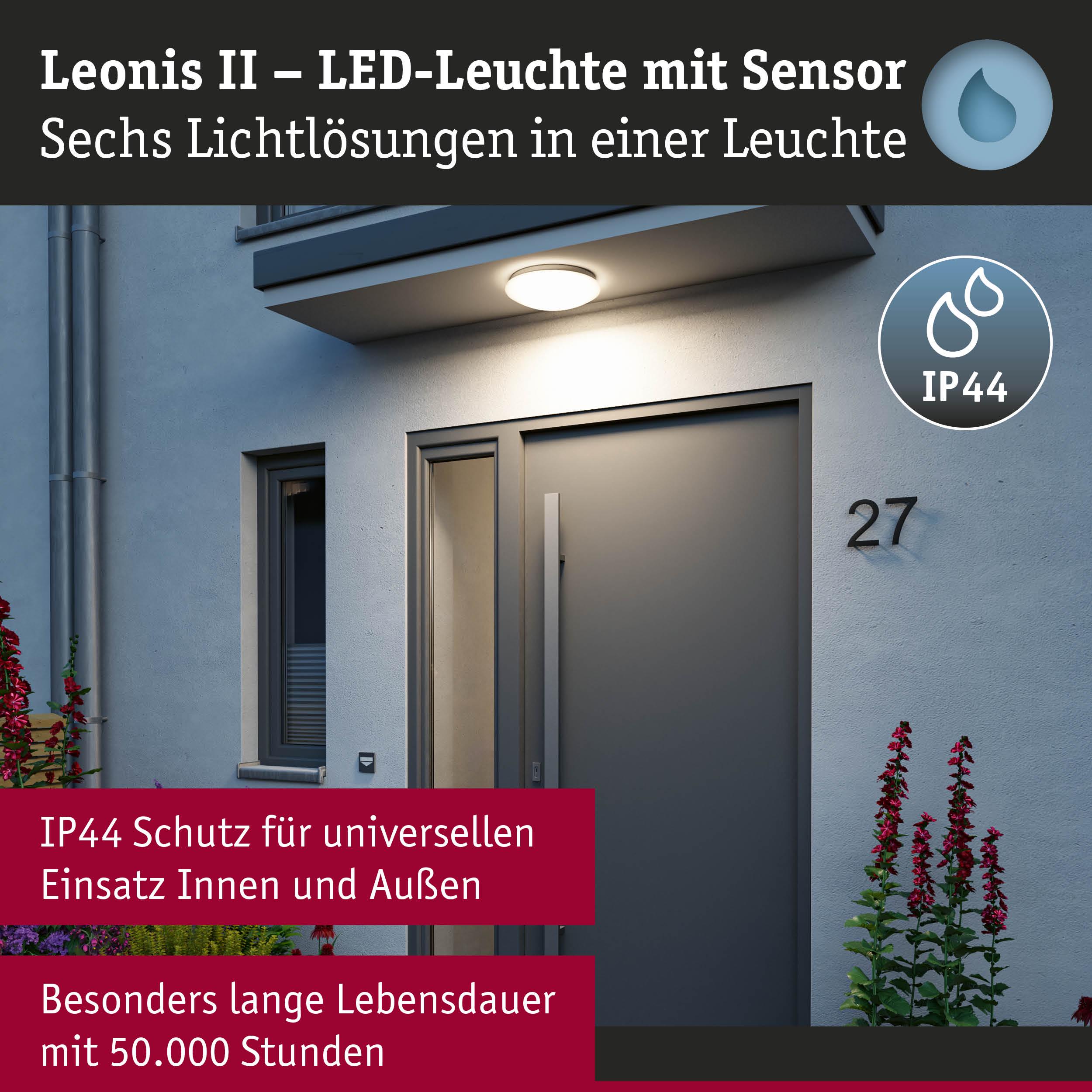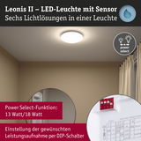 Die Deckenleuchte Leonis ist mit der White Select Funktion und dem integrierten Bewegungs- und Dämmerungssensor ein echter Allrounder. Neben vielseitigen Beleuchtungsmöglichkeiten sorgt sie durch die automatische Lichtsteuerung für ein hohes Maß an Sicherheit, Komfort und Energieeffizienz. Dank des hohen IP44-Schutzes eignet sich die Deckenleuchte in Weiß besonders gut in Feuchträumen und kann sowohl im Innen- als auch im Außenbereich eingesetzt werden. Sie ist somit ideal für Anwendungen in Badezimmern, Fluren, Küchen, Wirtschaftsräumen oder auf Terrassen geeignet. Durch Betätigen eines einfachen Dip-Schalters kann die Farbtemperatur je nach Wunsch auch nach der Montage ganz einfach eingestellt werden. Mit der innovativen Power Select Funktion lässt sich die Leistungsaufnahme der Leuchte steuern. Je nach Anwendungsbereich kann zwischen 13 W und 18 W gewählt werden. Der integrierte Dämmerungssensor steuert das Licht automatisch ab einer gewünschten Helligkeit bei Bedarf. – und der integrierte HF-Bewegungssensor schaltet das Licht ein, sobald sich jemand der Leuchte nähert. Ab welchem Abstand und mit welcher Leuchtdauer kann über den Hochfrequenzsensor eingestellt werden. Die Leuchtdauer lässt sich in verschiedenen Zeitintervallen einstellen: Egal, ob 5 Sekunden, 1 Minute, 3 Minuten oder bis zu 10 Minuten. Zusammen mit der Power Select Funktion kann so der Energieverbrauch optimiert werden, was nicht nur Kosten senkt, sondern auch gut für die Umwelt ist. In puncto Nachhaltigkeit überzeugt die Deckenleuchte Leonis außerdem mit einer besonders hohen Lebensdauer von 50.000 Stunden- ideal für eine langfristige und ressourcenschonende Nutzung!