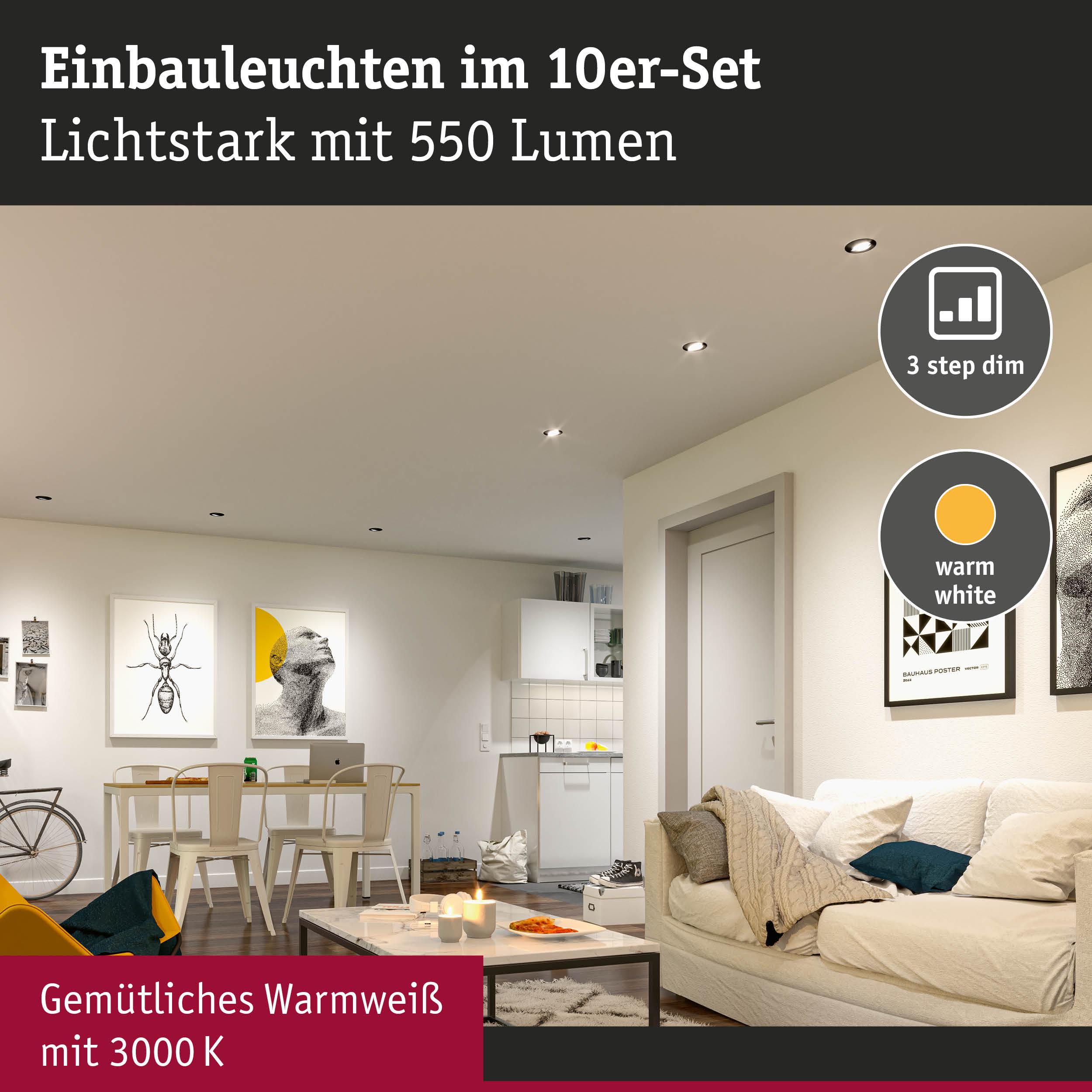 Schlichtes Design im 10er-Pack: die individuell schwenkbaren LED Einbauspots in zeitlosem Weiß bringen das Licht genau dorthin, wo es gebraucht wird. Dank integrierter 3-Step-Dim-Funktion, können sie durch mehrmaliges Betätigen eines handelsüblichen Lichtschalters in drei Stufen gedimmt werden.