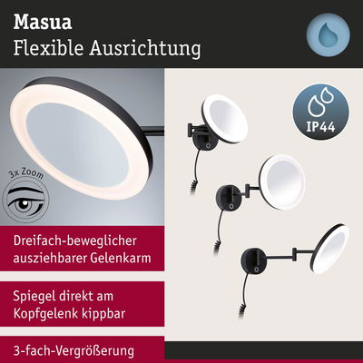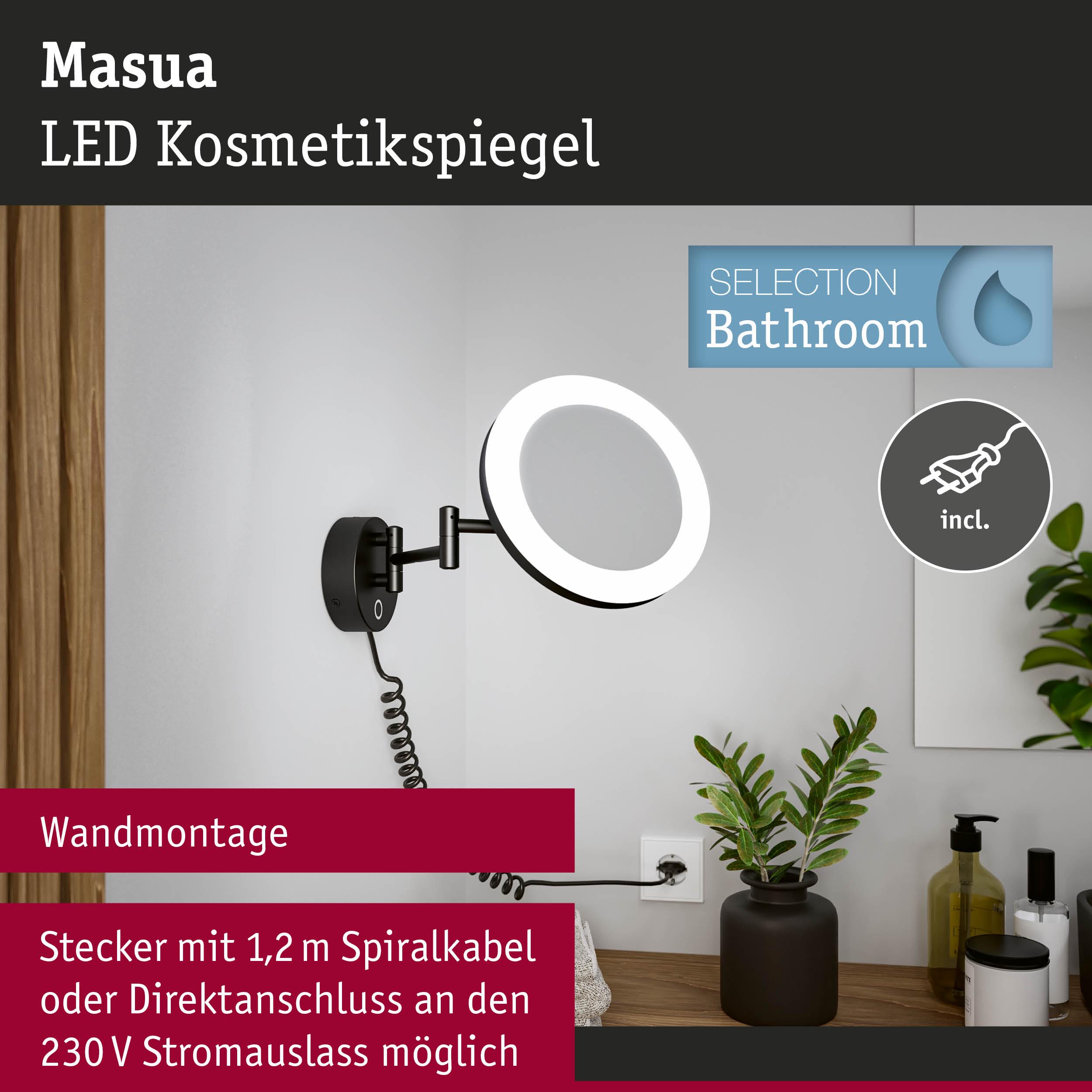 Der LED Kosmetikspiegel Masua in Schwarz matt wird an der Wand montiert und ist ein absolutes Highlight für jedes Badezimmer. Mit seinem ausziehbaren Arm und dem beweglichen, kipp- und schwenkbaren Spiegel bietet er höchste Flexibilität und ermöglicht es, den perfekten Blickwinkel zu finden. Der Spiegel verfügt zudem über eine 3-fache Vergrößerung, dabei sorgt der umlaufende LED-Strip für eine optimale Ausleuchtung. Dank des IP44-Schutzes ist der Spiegel in feuchten Umgebungen einsetzbar und somit perfekt für das private Wohlfühlbad und auch im gewerblichen Bereich, wie zum Beispiel in Hotels und Pensionen, geeignet. Mit der White-Switch-Funktion (2700K-6500K), kann die Lichttemperatur individuell per Touch-Schalter angepasst werden. Das 1,2m lange Steckerkabel ist abnehmbar für den 230V Direktanschluss.