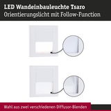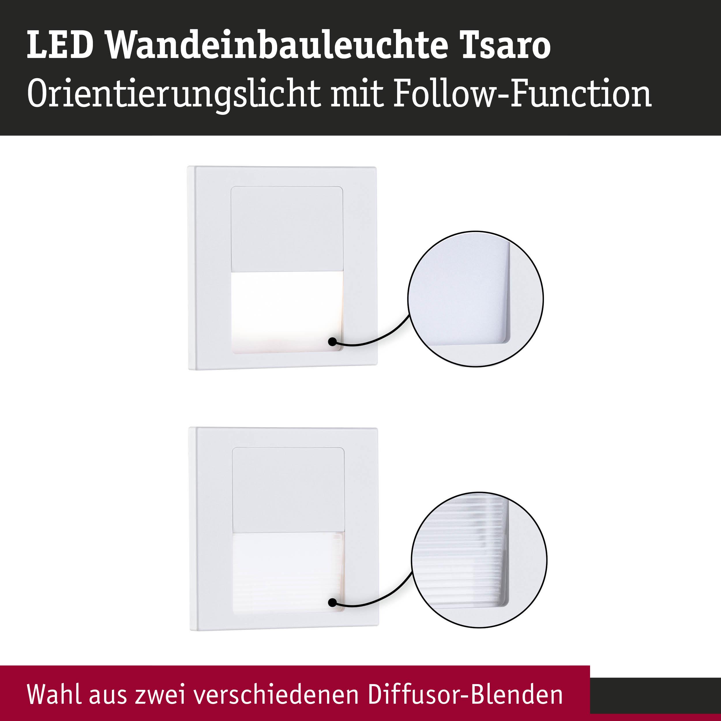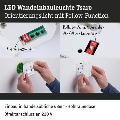Die Wandeinbauleuchte Tsaro in Weiß matt mit Follower-Funktion eignet sich ideal als Orientierungslicht für Flure, Treppen oder Laufwege und stellt die perfekte Erweiterung zum Leader-Modell dar. Mit der innovativen „Lead“ und „Follower“-Funktion wird eine energieeffiziente Steuerung ermöglicht. In einem System werden dabei sowohl sogenannte „Lead“ als auch „Follower“ Leuchten zusammengeschaltet. Die Leuchten mit Lead-Funktion verfügen über einen Dämmerungs- sowie einen integrierten Hochfrequenz-Sensor, der Bewegungen auf bis zu 3 Meter zuverlässig erfasst und ein Signal an alle Tsaro Leuchten derselben Frequenz sendet. Die Leuchten mit Follower-Funktion können dieses Funksignal empfangen und sich synchron schalten. Das warmweiße Licht mit einer Farbtemperatur von 2700K und einer Leistung von 1 Watt erlischt automatisch, wenn es nicht genutzt wird und aktiviert sich, sobald die Lead-Leuchte Bewegung wahrnimmt. Bei Bedarf lassen sich die Follower-Leuchten wie eine gewöhnliche Leuchte über einen handelsüblichen Lichtschalter steuern- auch ohne Verwendung der Leader-Leuchte. Für ein augenschonendes und blendfreies Licht sorgt die Diffusor-Blende, bei der zwischen einer glatten und einer strukturierten Oberfläche gewählt werden kann. Die Bauweise der Wandeinbauleuchte Tsaro ist für Standard-Unterputzdosen mit einem Durchmesser von 68mm optimiert und lässt sich daher besonders einfach installieren. Ein zusätzlicher Trafo wird nicht benötigt, da die Leuchten direkt am 230V Anschluss montiert werden können.