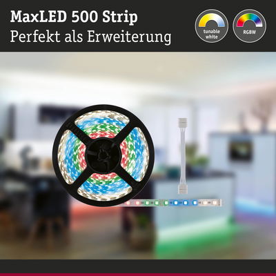 MaxLED-Strips sind so leistungsstark, dass sie problemlos zur Raumausleuchtung eingesetzt werden können. Dank der stimmungsvollen Farbwechselfunktion lässt sich ein individuelles Wohnambiente schaffen - von einfarbiger Dauerbeleuchtung bis hin zu mehrfarbigen Lichteffekten ist alles möglich. Eine Diode in Weiß (W) sorgt zusätzlich für wohnliches warmweißes Licht und macht das Mischen eines Weißtons aus den Farben Rot, Grün und Blau (RGB) überflüssig. Auf Grund der Länge von 10m ist der Strip optimal für den Einsatz von Objektinstallationen oder größeren Projekten geeignet. Mithilfe der drei enthaltenen Adapterkabel lassen sich mehrere Strips untereinander verbinden.