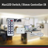 Mit dem MaxLED Dimm/Schalt Controller und der mitgelieferten Infrarotfernbedienung lassen sich einfarbige MaxLED-Strips schalten und dimmen. Dazu ist ein sichtbarer Kontakt zwischen der Fernbedienung und dem Empfänger erforderlich. Die vier Speicherplätze ermöglichen die Programmierung individueller Wunscheinstellungen.