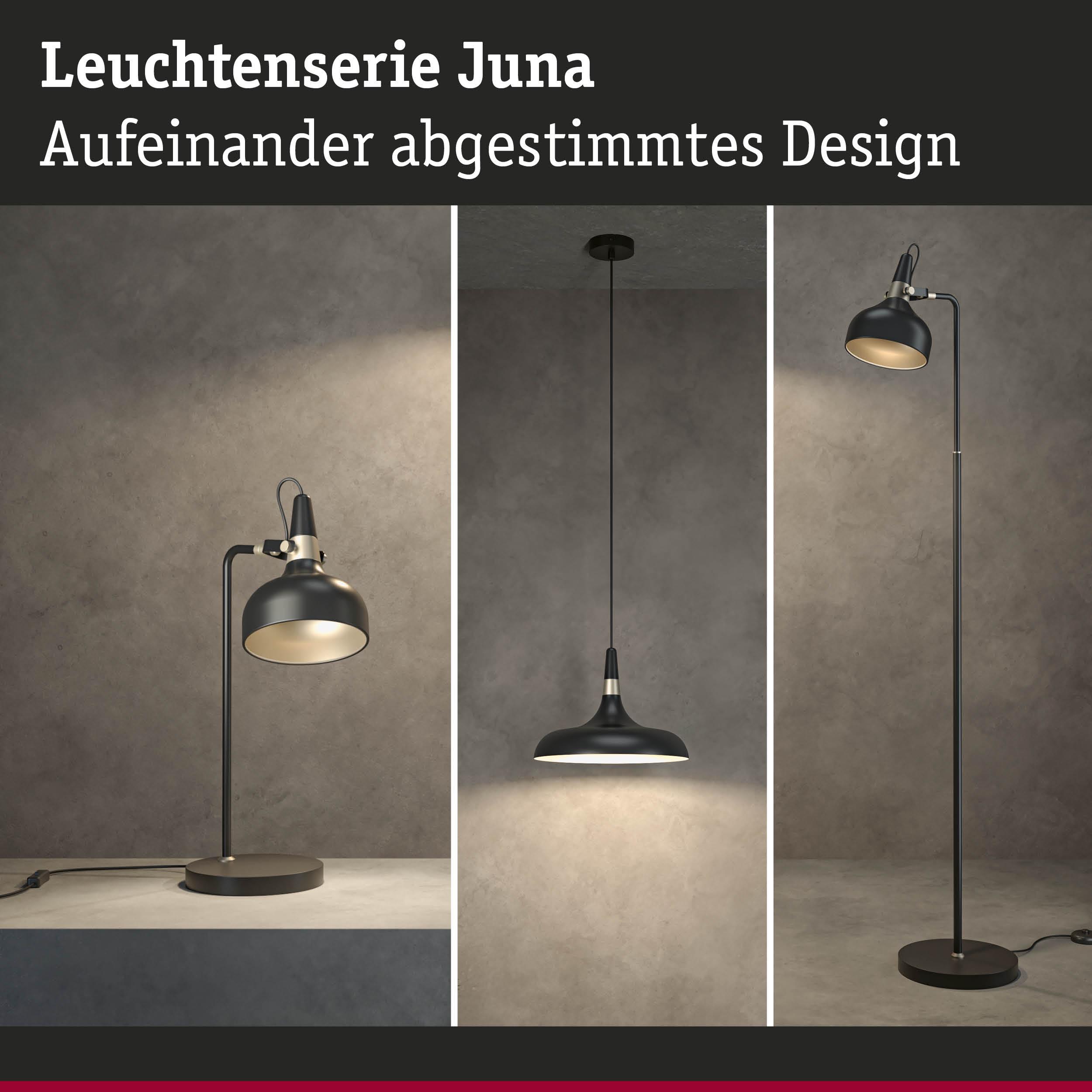 Mit ihrer zeitlosen und zugleich modernen Form- und Designsprache passt die Leuchtenserie Juna in unterschiedlichste Einrichtungsstile und setzt attraktive Lichtakzente im Wohnbereich. Nach Belieben lassen sich die aufeinander abgestimmten Tisch- Steh- und Pendelleuchten der Serie harmonisch miteinander kombinieren. Die schwarz matte Tischleuchte mit ästhetischen Farbakzenten in Champagnergold ist vielseitig einsetzbar und eignet sich ideal auf dem Nachttisch, als Schreibtischleuchte oder als dekorativer Hingucker auf dem Sideboard. Ihre hochwertige Verarbeitung sorgt nicht nur für eine ansprechende Optik, sondern auch für eine lange Lebensdauer. Der bewegliche Leuchtenkopf ermöglicht eine flexible Ausrichtung des Lichts, während das farblich abgestimmte Textilkabel eine bequeme und sichere Nutzung sicherstellt. Als Leuchtmittelempfehlung eignen sich insbesondere dekorative Kopfspiegellampen mit einem E14-Sockel, die für ein blendfreies Licht sorgen.
