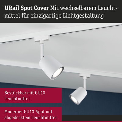 Volle Flexibilität bei der Auswahl des Leuchtmittels bietet der Signalweiße URail Spot Cover. Es lassen sich beliebige Leuchtmittel mit GU10-Sockel und einer Leistung von maximal Watt einsetzen, egal ob weißes oder buntes Licht, starke oder weniger starke Lichtbündelung. Das dezente Design des Spots passt zu jedem Einrichtungsstil und eröffnet vielfältige Einsatzmöglichkeiten.