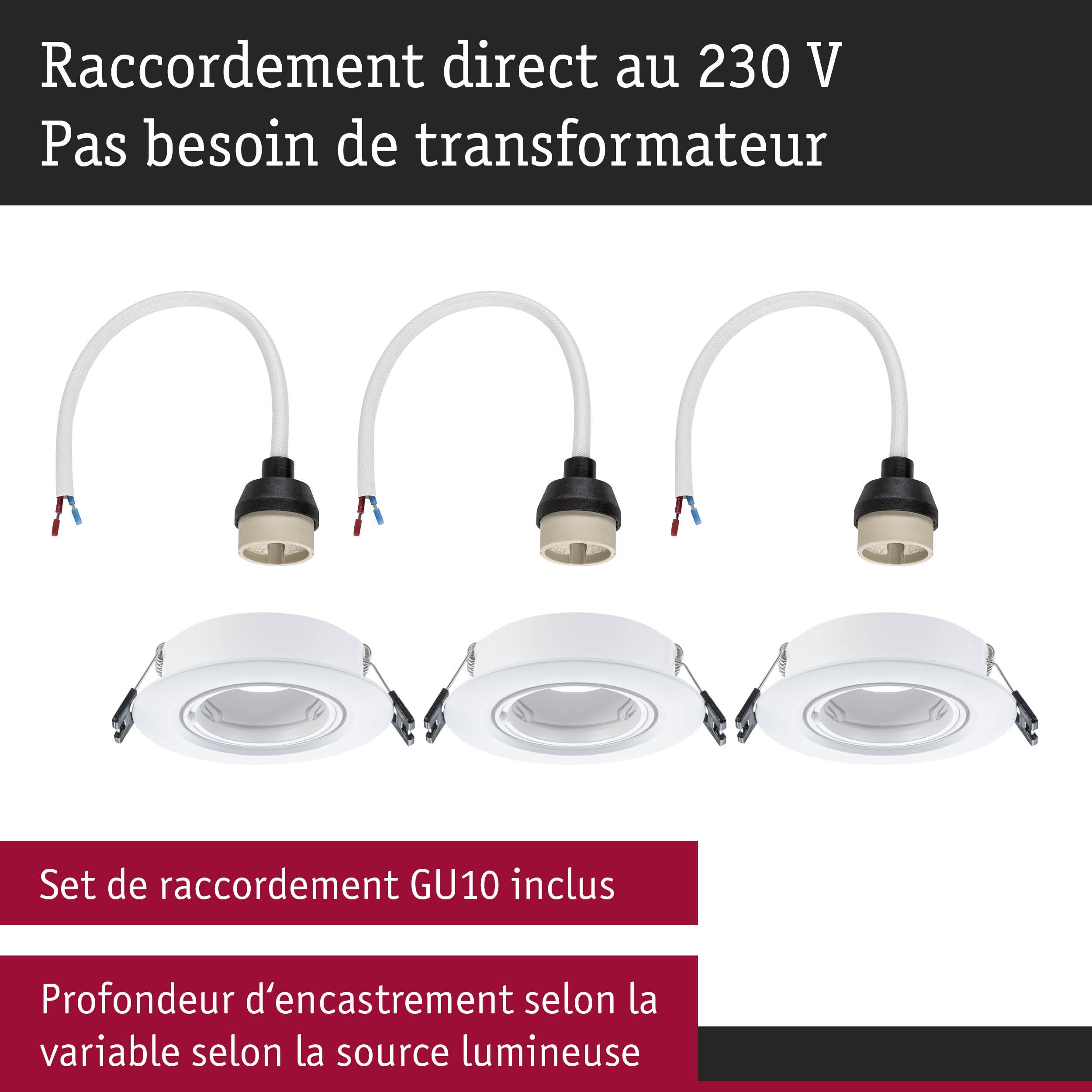 Spot encastré Kit de 3 orientable rond 90mm 30° GU10 max. 3x10W 230V gradable Blanc