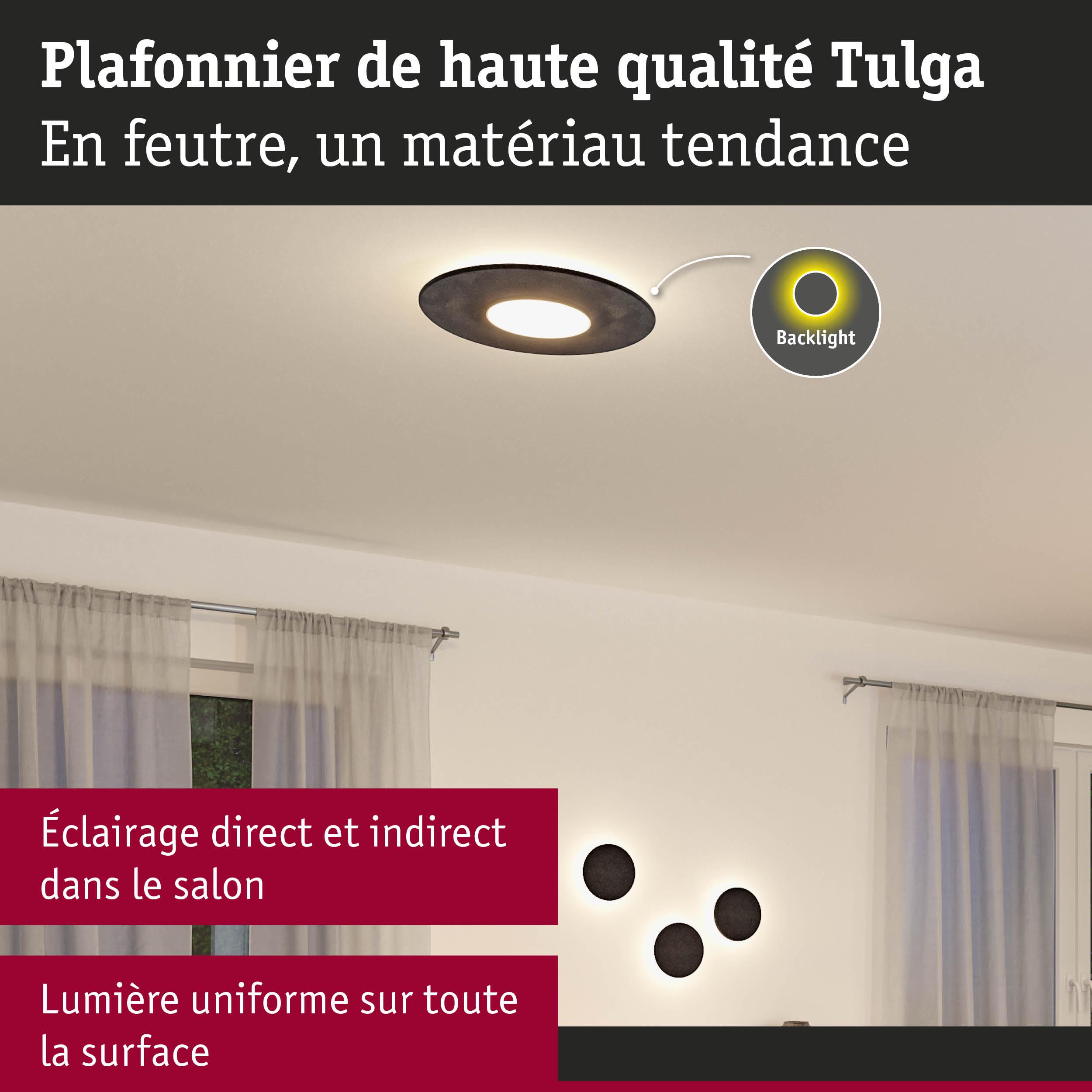 Le plafonnier LED intelligent Tulga en feutre et coloris Anthracite avec 1600lm / 0lm impressionne par son design moderne et sobre et crée une atmosphère agréable. En outre, ce multitalent réduit les bruits de fond dérangeants. Autre atout : ce luminaire est en matériau durable et recyclable. La technologie Backlight crée une atmosphère de bien-être particulière et donne comme l’impression que l’éclairage du plafonnier est en apesanteur. La fonction Tunable White permet de varier la température de couleur à votre guise : du blanc lumière du jour pour le travail au blanc chaud idéal pour la relaxation. Le luminaire est compatible Zigbee 3.0. ZigBee 3.0 est un protocole de transmission radio qui met en réseau les appareils de différents fabricants.
