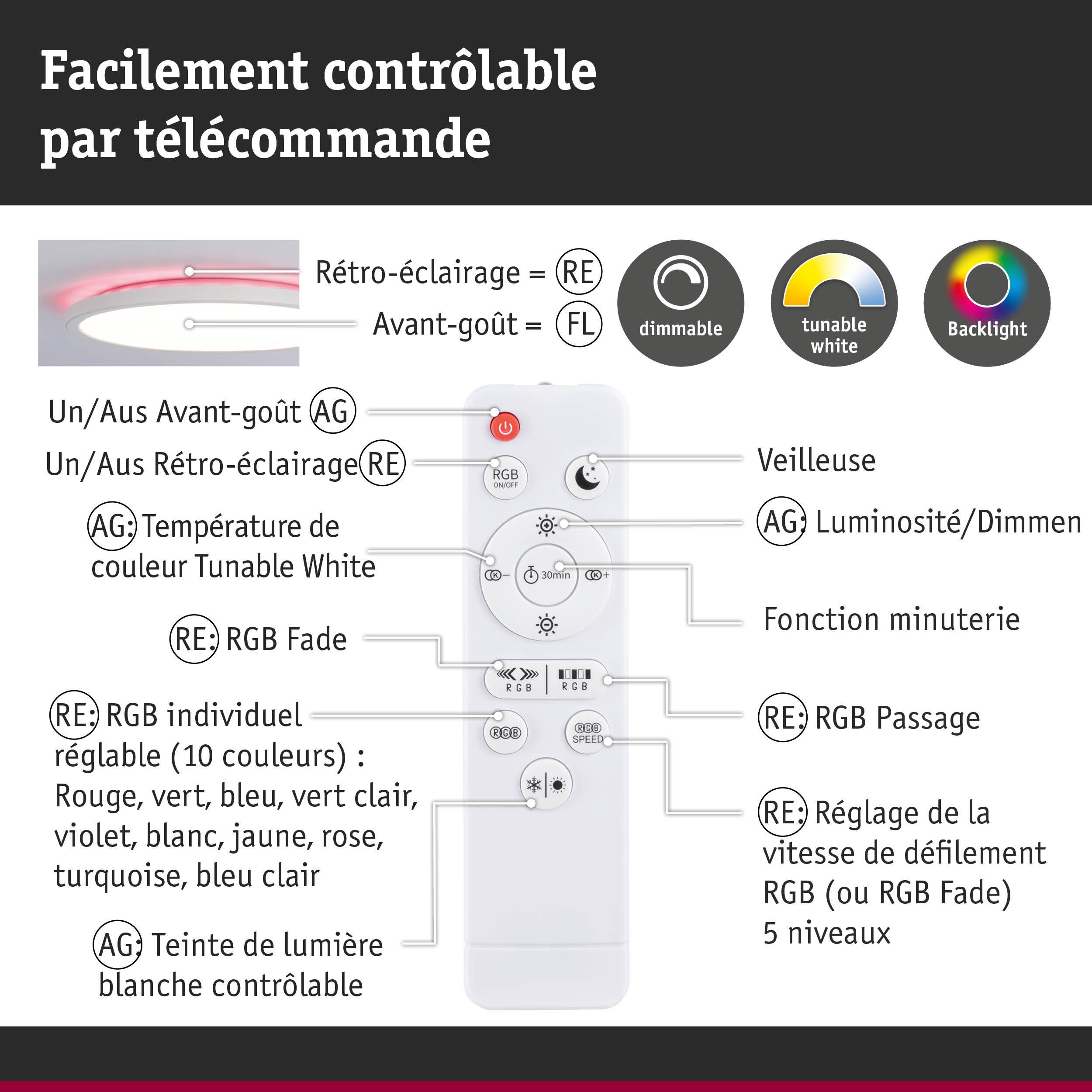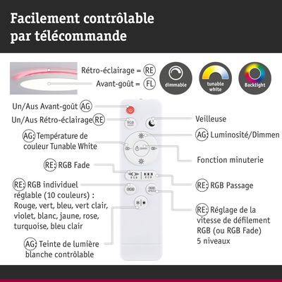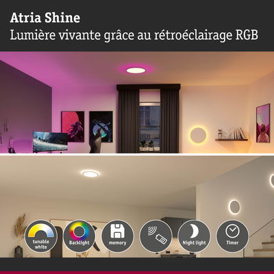 Le panneau polyvalent Atria Shine, d'un diamètre de 400mm, offre un éclairage à la fois direct et indirect, grâce à sa technologie Backlight et Frontlight contrôlable séparément. Le frontlight dispose de la fonction Tunable White, tandis que le backlight crée une atmosphère particulière dans la pièce grâce à sa fonction RGB. La fonction Tunable White permet de régler la température de couleur de la lumière, du blanc chaud au blanc lumière du jour. Grâce à la fonction mémoire, le scénario d'éclairage choisi est enregistré et à la prochaine mise en marche, le luminaire s’allumera avec l'intensité lumineuse préréglée. La télécommande permet de régler individuellement le Backlight et le Frontlight et d'activer d'autres fonctions telles que la minuterie ou le défilement des couleurs RGB. Le design sobre du panneau séduit par son design particulièrement plat et la technologie de Backlight d'ambiance confère au panneau un aspect discret, presque flottant. Le panneau Atria Shine est parfaite pour les champs d’application les plus variés. Par exemple, dans une chambre d'adolescent, le panneau peut créer une atmosphère moderne et agréable grâce à ses multiples options d'éclairage et de changement de couleur, qui invitent à la fois à l'étude et à la détente. Le rétroéclairage RGB constitue également un complément parfait à l'éclairage de base dans la pièce de gaming. Le montage au mur ou au plafond est particulièrement simple et facile grâce au clip de fixation rapide et à la fermeture à vis.