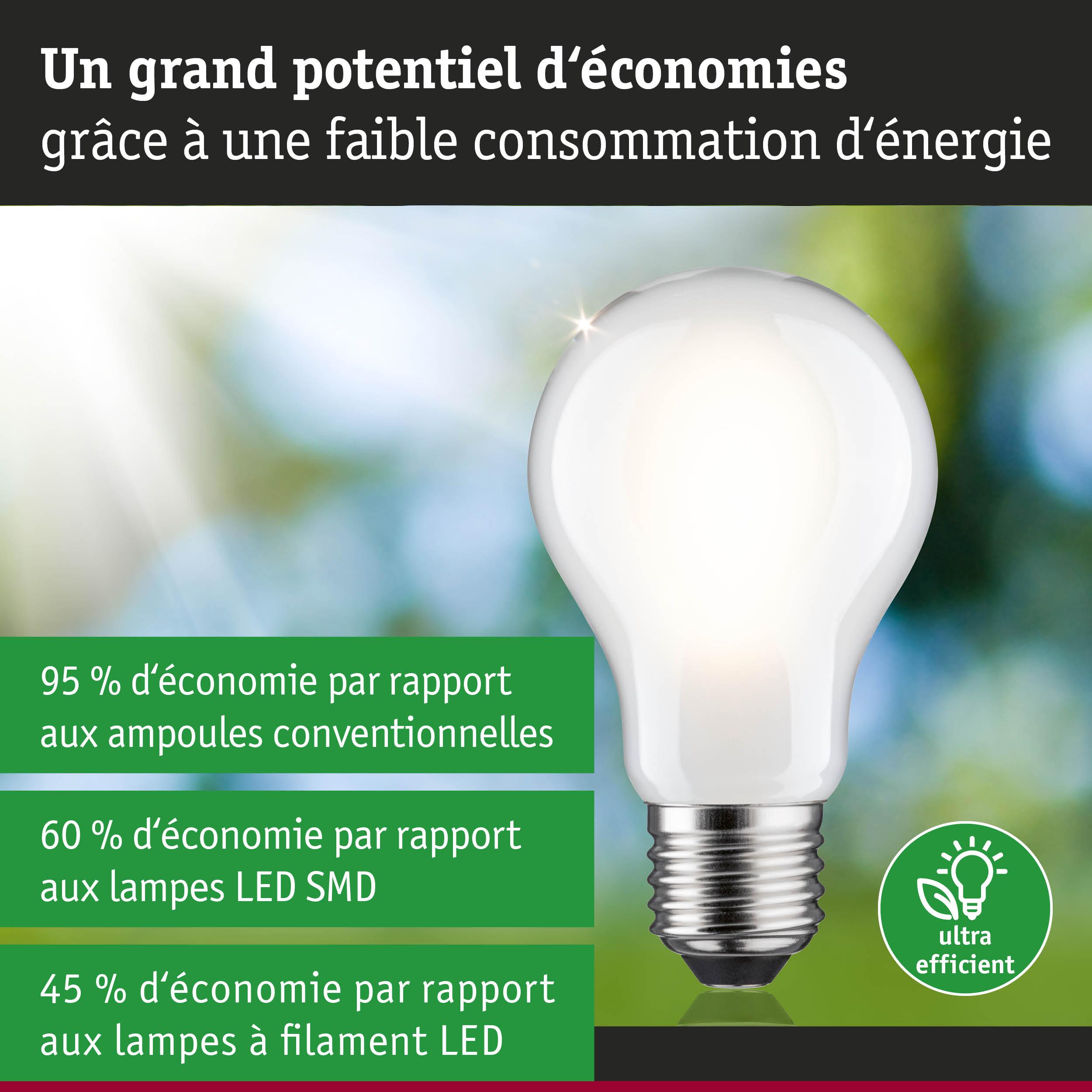 Les ampoules LED ultra efficaces de la gamme LED Eco-Line allient technologie innovante et durabilité pour un éclairage efficace et stylé. La consommation d'énergie réduite de 60% et la durée de vie nettement plus longue que les ampoules LED standard permettent de réduire considérablement les coûts énergétiques tout en préservant l'environnement. L'ampoule LED à filament dépolie s'adapte à toutes les douilles E27 courantes et produit, avec 3000K, une puissance de 8,2W, une lumière blanc chaud agréable sans teinte verte. Même les grands abat-jour sont éclairés de manière uniforme, ce qui apporte à chaque pièce une ambiance de bien-être harmonieuse. Selon les besoins, l'intensité lumineuse de l'ampoule peut être graduée sur 3 niveaux à l'aide d'un interrupteur conventionnel. Le variateur dispose d'une fonction mémoire. Les ampoules LED Paulmann portant le label Eye friendly produisent une lumière confortable qui préserve les yeux. Que ce soit pour travailler, lire ou se détendre, les ampoules contribuent à un meilleur confort visuel.