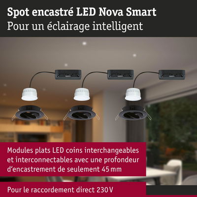 16 millions de couleurs, 16 millions d'ambiances lumineuses – Le set de spots encastrés intelligents Nova Coin en Noir mat avec fonction de changement de couleur confère à chaque pièce une ambiance lumineuse personnalisée. La livraison comprend trois ampoules LED interchangeables, y compris des bagues de montage en alu de haute qualité. Avec une puissance de 3x6 watts et le système de contrôle Zigbee 3.0 RGBW, ils fournissent une solution d'éclairage efficace et innovante. ZigBee 3.0 est un protocole de transmission radio qui met en réseau les appareils de différents fabricants. Ainsi, les luminaires peuvent être pilotés individuellement ou collectivement via une application, une télécommande ou une commande vocale : Qu'il s'agisse d'une lumière dorée chaude et confortable (2200 K), d'un blanc lumière du jour sobre et lumineux (6500 K) ou de dégradés de couleurs multicolores, la combinaison de Tunable White, RGB et de la fonction de variation d’intensité offre d'innombrables possibilités. Les spots encastrés intelligents peuvent être allumés et éteints facilement et confortablement à l'aide d'un interrupteur conventionnel. La fonction mémoire intégrée se souvient toujours du dernier réglage d’éclairage utilisé – pour un confort maximal. Grâce à la capacité de pivotement des luminaires, la lumière se diffuse précisément là où vous le souhaitez. Le montage est particulièrement simple et efficace grâce aux Coins chaînables et interchangeables, à la faible profondeur d'encastrement (seulement 45 mm) et au raccordement direct en 230 V.