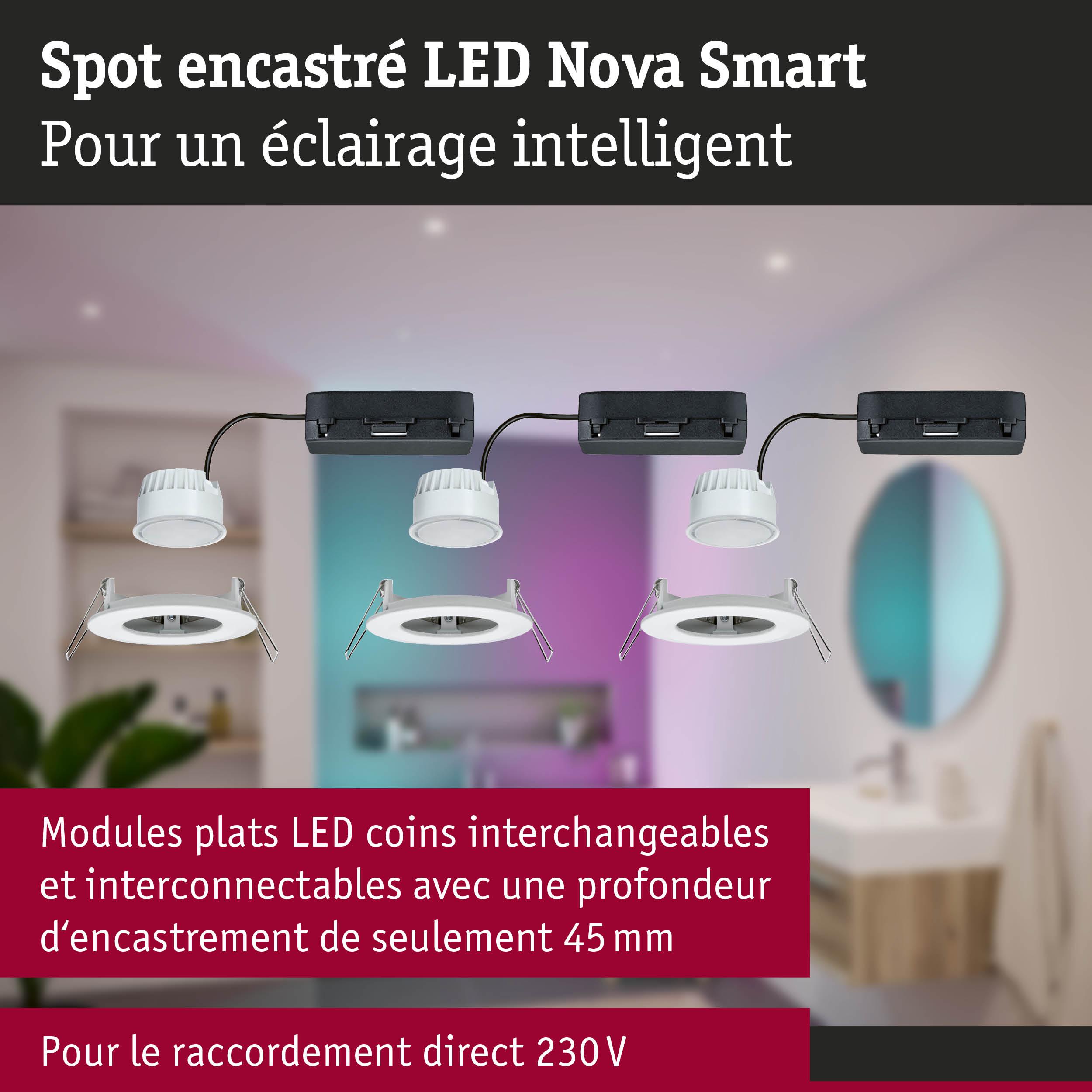 16 millions de couleurs, 16 millions d'ambiances lumineuses – Le set de spots encastrés intelligents Nova Coin en Blanc dépoli avec fonction de changement de couleur confère à chaque pièce une ambiance lumineuse personnalisée. Trois ampoules LED interchangeables sont fournies avec des bagues de montage en alu de haute qualité. Grâce à une protection IP particulièrement élevée de IP44, les luminaires sont également parfaits pour les pièces humides car il est protégé contre les projections d’eau. Avec une puissance de 3x6 watts et le système de contrôle Zigbee 3.0, ils fournissent une solution d'éclairage efficace et innovante. ZigBee 3.0 est un protocole de transmission radio qui met en réseau les appareils de différents fabricants. Ainsi, les luminaires peuvent être pilotés individuellement ou collectivement via une application, une télécommande ou une commande vocale : Qu'il s'agisse d'une lumière dorée chaude et confortable (2200 K), d'un blanc lumière du jour sobre et lumineux (6500 K) ou de dégradés de couleurs multicolores, la combinaison de Tunable White, RGB et de la fonction de variation d’intensité offre d'innombrables possibilités. Le spot encastré intelligent peut être allumé et éteint facilement et confortablement à l'aide d'un interrupteur conventionnel. La fonction mémoire intégrée se souvient toujours du dernier réglage d’éclairage utilisé – pour un confort maximal. Grâce à la capacité de pivotement du luminaire, la lumière se diffuse précisément là où vous le souhaitez. Le montage est particulièrement simple et efficace grâce aux Coins chaînables et interchangeables, à la faible profondeur d'encastrement (seulement 45 mm) et au raccordement direct en 230 V.