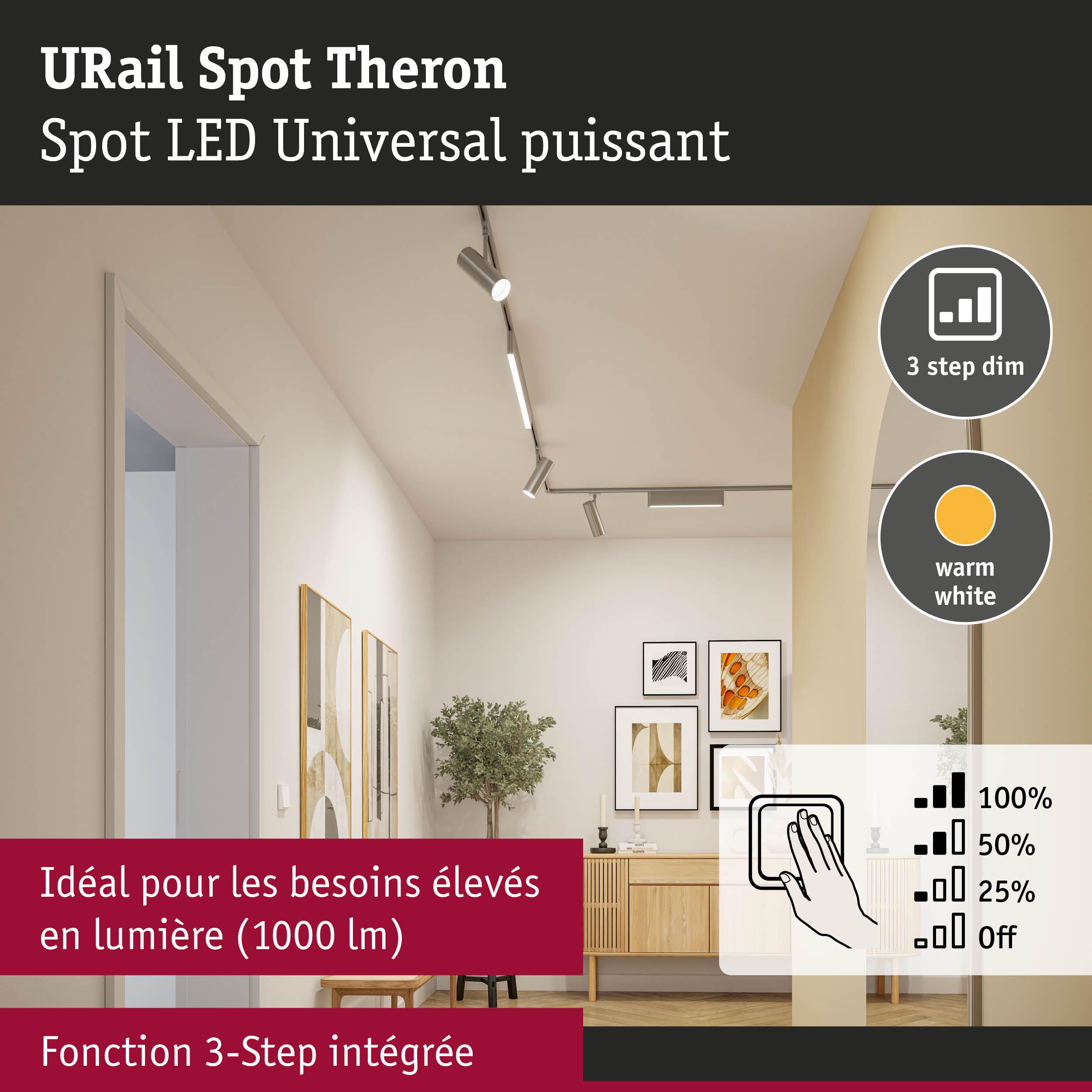 Le spot sur rail blanc chaud Theron en Chrome mat est particulièrement économe en énergie et crée un éclairage très lumineux avec une puissance de plus de 1000lm. Le rendu des couleurs élevé de IRC≥ 90 pour des couleurs naturelles et éclatantes. La lumière est facile à diriger, car le spot cylindrique est orientable. Un interrupteur conventionnel permet de régler l’intensité lumineuse sur 100 %, 50 % et 25 % – vous pouvez ainsi adapter l’éclairage à chaque situation. Grâce à la fonction mémoire intégrée, le dernier niveau de variation sélectionné est activé lors de la remise en marche. La durée de vie élevée de 50.000 h garantit une utilisation à long terme du spot LED Ainsi, avec les composants URail adéquats, il est possible de créer un système d’éclairage personnalisé d’une puissance totale de 1 000 W max.