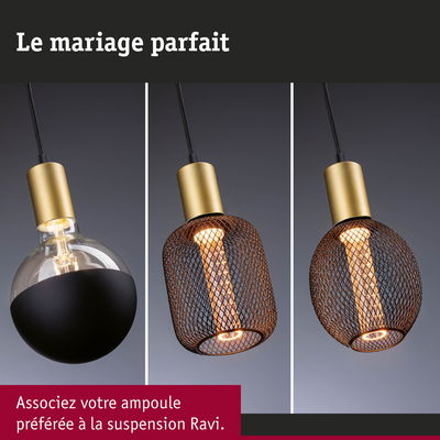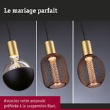 L’effet Mix & Match résolument tendance permet d'embellir l'intérieur avec un accroche-regard original. Le luminaire en suspension moderne Ravi en Noir mat/Doré en est l'illustration parfaite. Avec son design moderne minimaliste et sa combinaison de coloris attrayante, cette pièce phare est du plus bel effet dans un intérieur. En combinaison avec les ampoules décoratives de Paulmann, il forme le duo parfait. Le luminaire offre un effet particulièrement harmonieux lorsqu'il est associé à des ampoules des séries White Lampion ou Metallic Glow. Les ampoules équipées de culot E27 et de max. 60 watts offrent une autre alternative. Grâce à la protection IP44, l'applique Ravi peut même être utilisée dans la salle de bain.