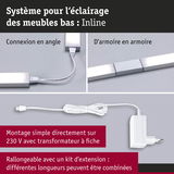 Le lot de deux éclairages sous-meubles Inline extensible en Blanc dépoli discret et de longueur 350x26mm offre une solution élégante pour l'éclairage des plans de travail. Ces luminaires pour meubles garantissent un éclairage optimal et créent une atmosphère agréable. Grâce à leur commande sans contact, ils permettent une manipulation hygiénique. Le kit de démarrage est extensible et peut être prolongé par un kit d'extension au maximum. Plusieurs longueurs peuvent être combinées entre elles pour obtenir la solution d'éclairage recherchée. De plus, la fonction de variation d’intensité permet d'adapter la température de couleur blanc chaud en fonction des besoins individuels. Le raccordement se fait directement au réseau 230 V avec un transfo-prise.