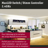 Avec le contrôleur variateur/commutateur MaxLED et la télécommande sans fil également fournie, vous pouvez allumer, éteindre ou varier les rubans monochromes MaxLED. De plus, aucun contact visible n'est nécessaire entre la télécommande et le récepteur. La portée peut atteindre 30 mètres sans problème.