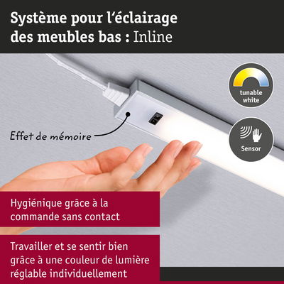 Le kit d'extension comprenant deux éclairages de meubles Inline en Blanc dépoli discret et de longueur 550x26mm est le complément parfait du kit de démarrage Inline. Ces luminaires sont une solution élégante pour illuminer les plans de travail de manière optimale. Les matériaux de haute qualité faciles à nettoyer font de l'entretien du dispositif un jeu d'enfants. Le détecteur de proximité permet une mise en marche et un arrêt sans contact, ce qui contribue en outre à un mode de travail hygiénique. La fonction Tunable White permet d'adapter l'éclairage aux besoins individuels - qu'il s'agisse de se concentrer ou de se détendre dans une atmosphère agréable. La fonction mémoire qui enregistre la température de couleur paramétrée est un plus.