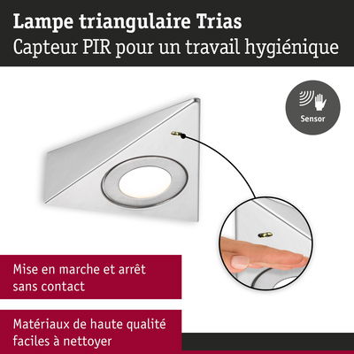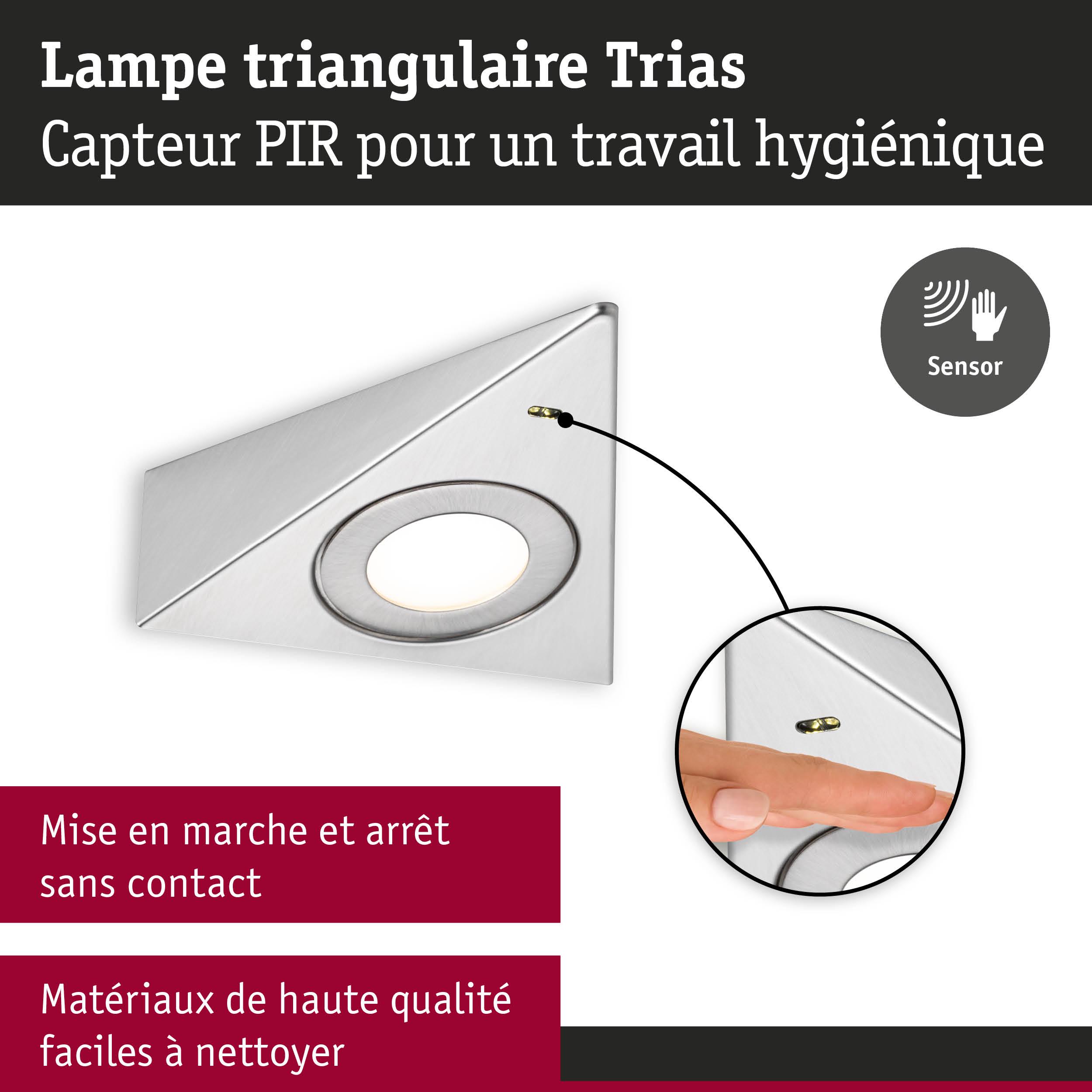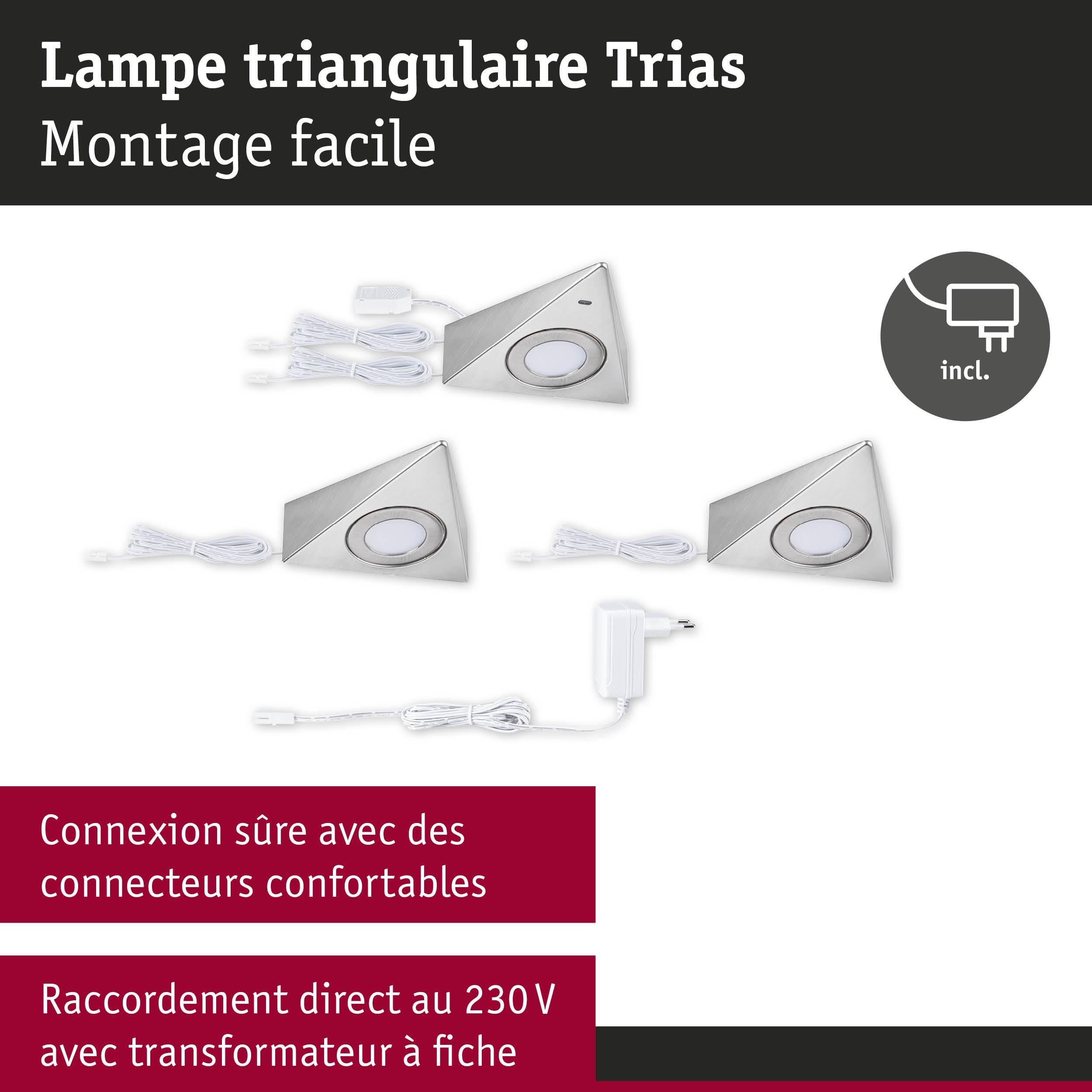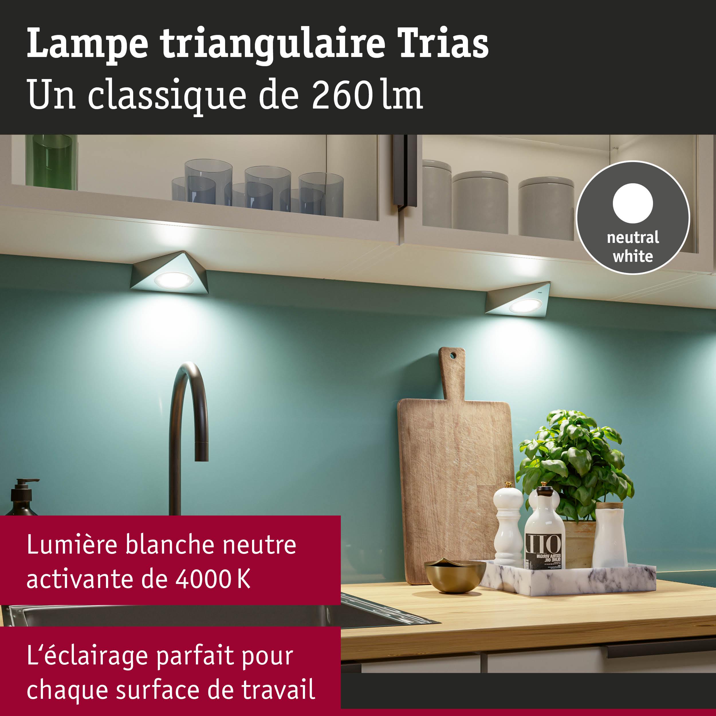 Le lot comprenant trois éclairages de meubles Trias est idéal pour la cuisine. Ces luminaires ne sont pas uniquement un accroche-regard, leur aspect pratique est redoutable. Faciles à poser, ils s'intègrent sans problème dans toutes les cuisines. Le commutateur marche/arrêt sans contact avec détecteur de proximité est un plus. Avec sa température de couleur blanc neutre, la lumière est claire et idéale pour éclairer un plan de travail de manière optimale. Conçus en matériaux de haute qualité faciles à nettoyer, ces luminaires sont garantis faciles d'entretien. Le montage se fait directement au réseau 230 V avec la transfo-prise fournie.