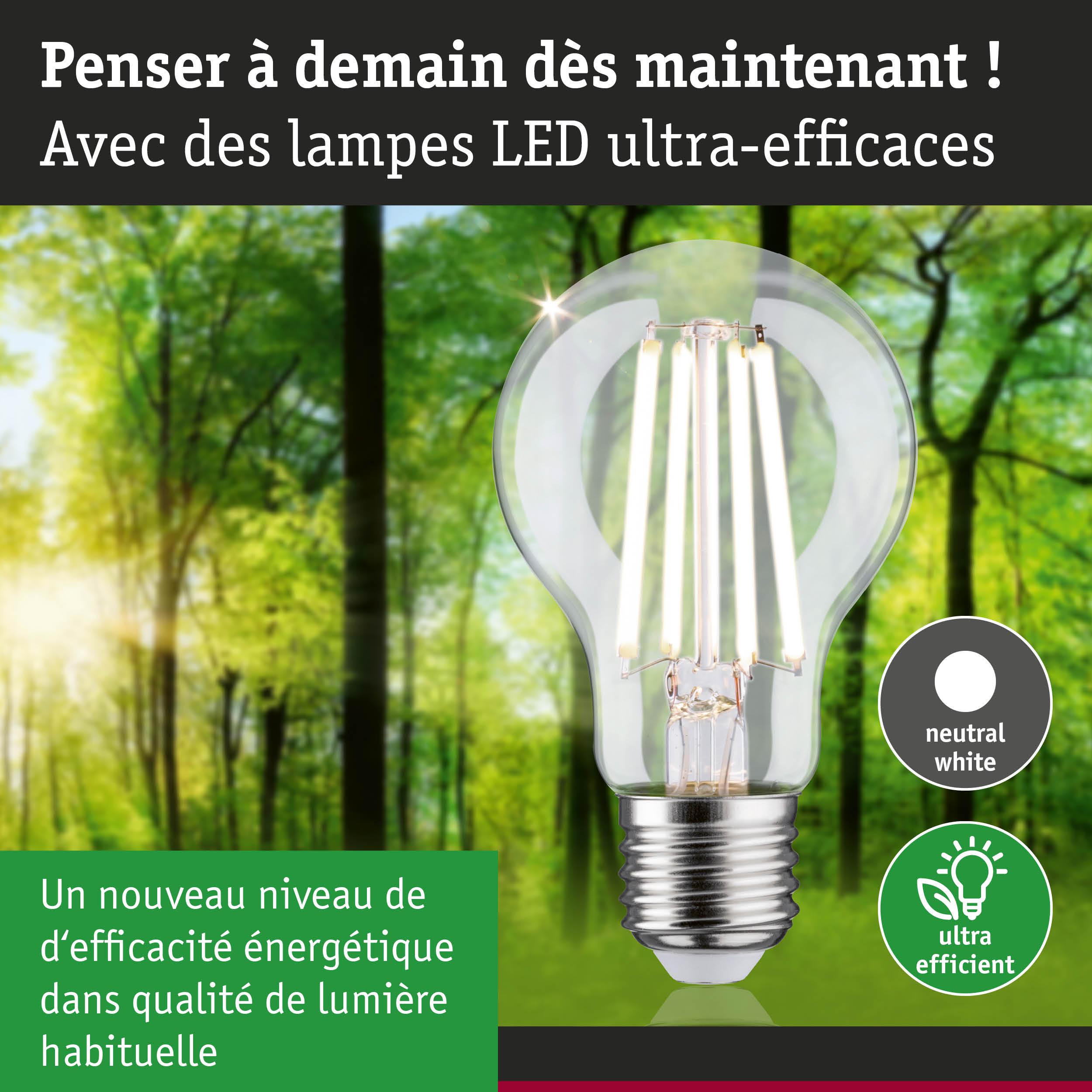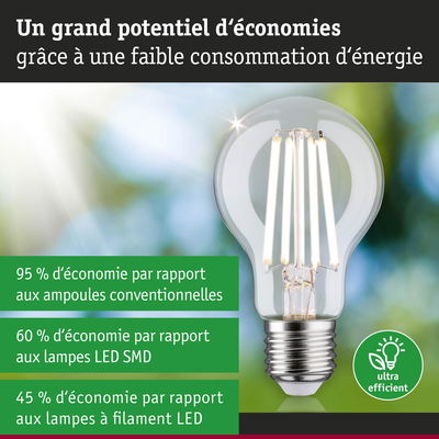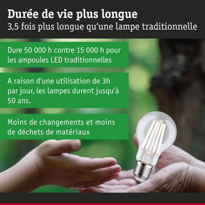 Les ampoules ultra efficaces de l'Eco-Line combinent innovation et durabilité. Grâce à une consommation d'énergie réduite de 60 % et à une durée de vie résolument plus longue que celle des ampoules LED standard, il est possible de réduire considérablement les coûts énergétiques tout en préservant l'environnement. L’ampoule LED à filament avec 4000K, une puissance de 4,5W et 840lm diffuse un éclairage uniforme agréable sans teinte verdâtre. L’ampoule est compatible avec les douilles E27 conventionnelles. Éclaire de façon uniforme même les plus grands abat-jour. L’ampoule est gradable en continu. Les ampoules LED Paulmann portant le label Eye friendly produisent une lumière confortable qui préserve les yeux. Que ce soit pour travailler, lire ou se détendre, les lampes contribuent à un meilleur confort visuel.
