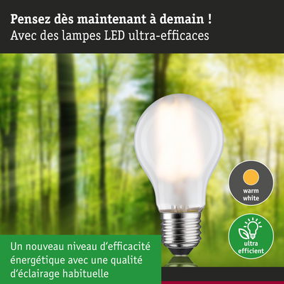 Les ampoules ultra efficaces de l'Eco-Line combinent innovation et durabilité. Grâce à une consommation d'énergie réduite de 60 % et à une durée de vie résolument plus longue que celle des ampoules LED standard, il est possible de réduire considérablement les coûts énergétiques tout en préservant l'environnement. L’ampoule LED à filament avec 3000K, une puissance de 4W et 840lm diffuse un éclairage uniforme agréable sans teinte verdâtre. L’ampoule est compatible avec les douilles E27 conventionnelles. Éclaire de façon uniforme même les plus grands abat-jour. Les ampoules LED Paulmann portant le label Eye friendly produisent une lumière confortable qui préserve les yeux. Que ce soit pour travailler, lire ou se détendre, les lampes contribuent à un meilleur confort visuel.