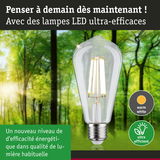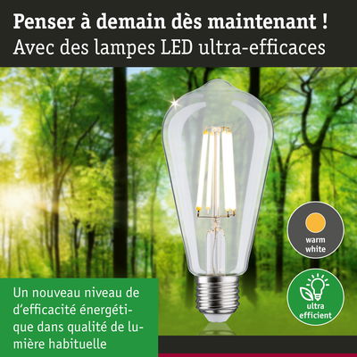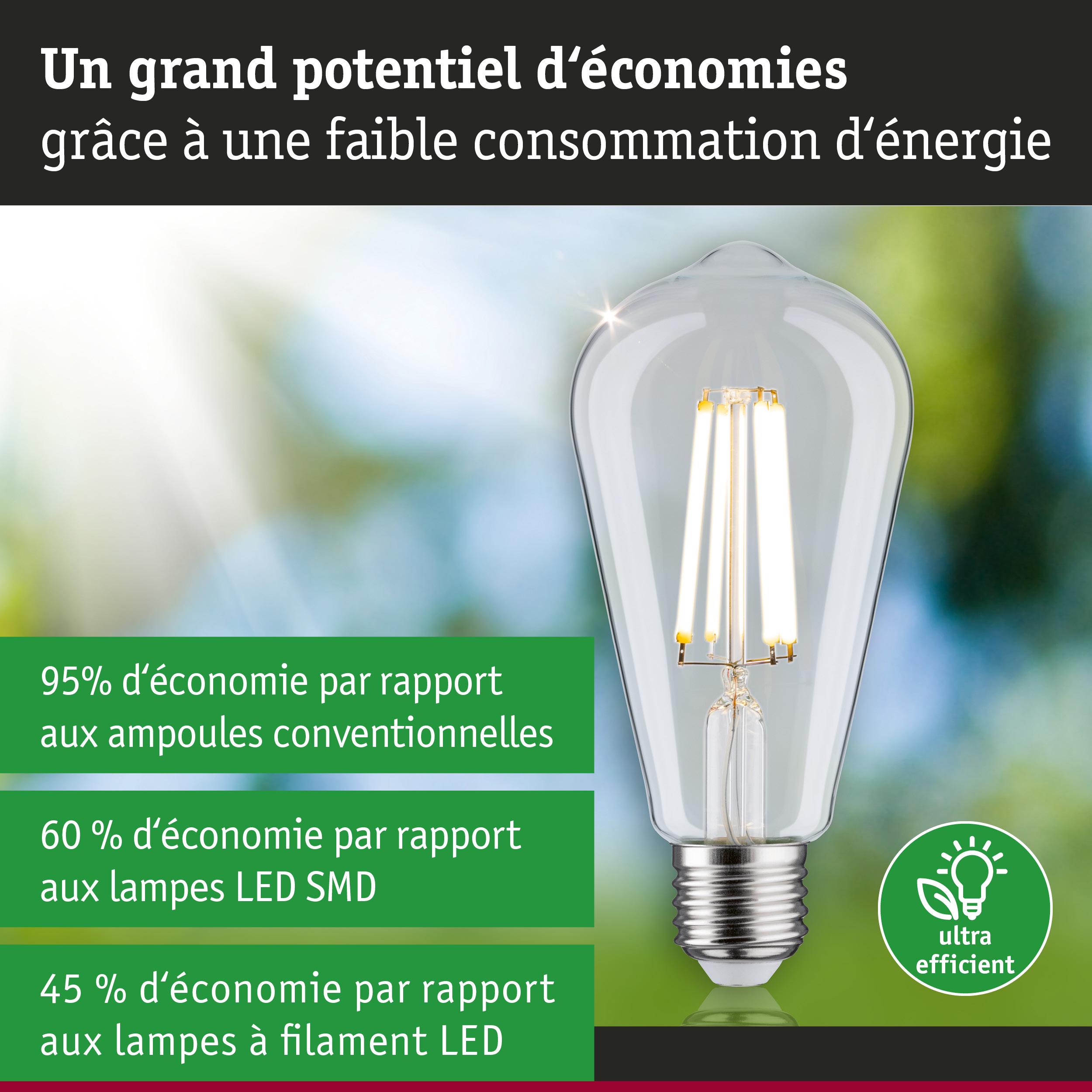 Les ampoules ultra efficaces de l'Eco-Line combinent innovation et durabilité. Grâce à une consommation d'énergie réduite de 60 % et à une durée de vie résolument plus longue que celle des ampoules LED standard, il est possible de réduire considérablement les coûts énergétiques tout en préservant l'environnement. L'ampoule cylindrique à filament claire avec 3000K, une puissance de 4W et 840lm diffuse sa lumière dans toutes les directions sans teinte verdâtre. Les lampes LED confèrent une parfaite ambiance Vintage et, installées dans des suspensions rétro, sont de vraies accroche-regard. Elle a une température de couleur blanc chaud et est compatible avec les douilles E27 conventionnelles. Les lampes LED Paulmann portant le label Eye friendly produisent une lumière confortable qui préserve les yeux. Que ce soit pour travailler, lire ou se détendre, les lampes contribuent à un meilleur confort visuel.