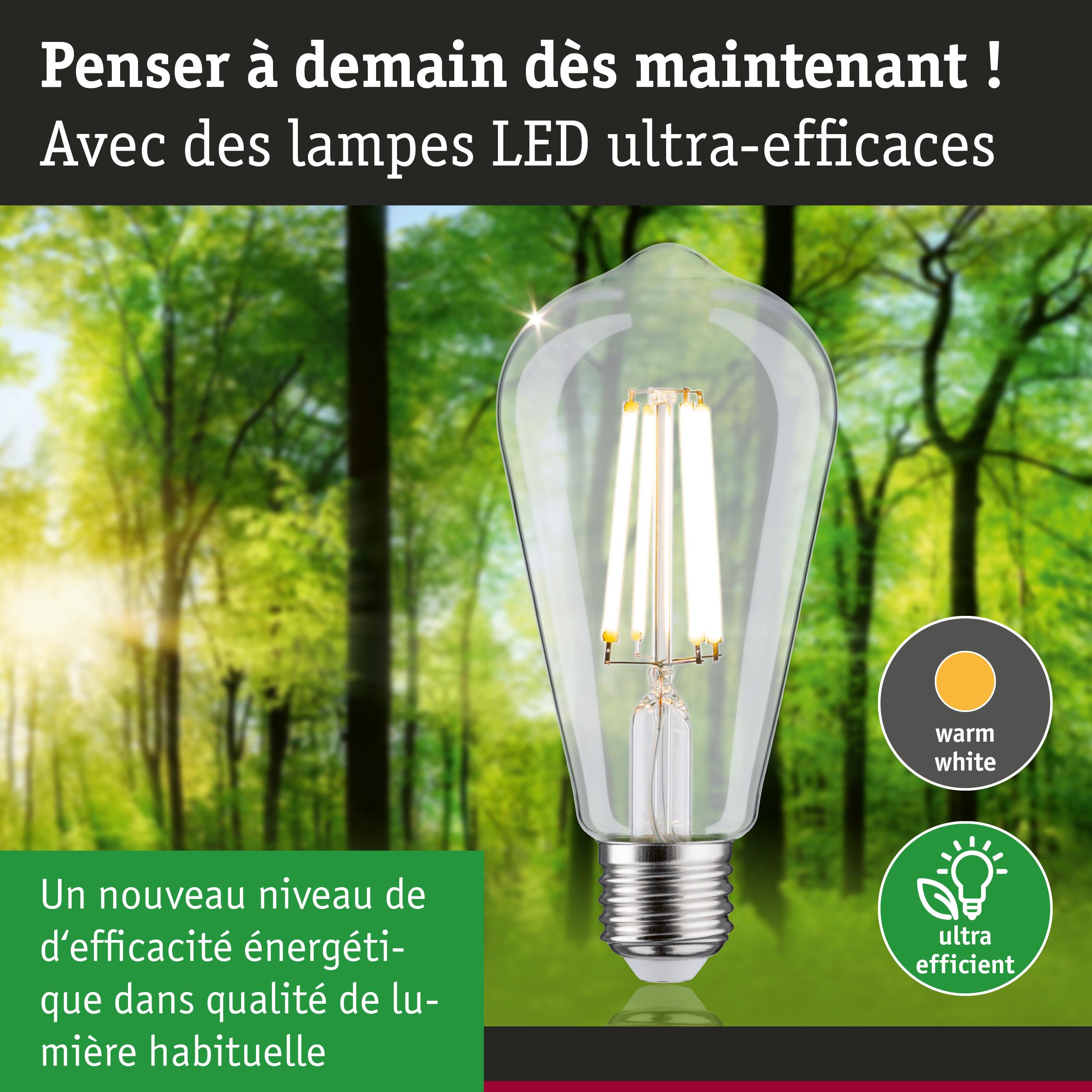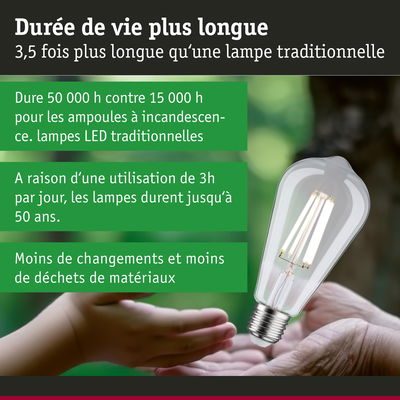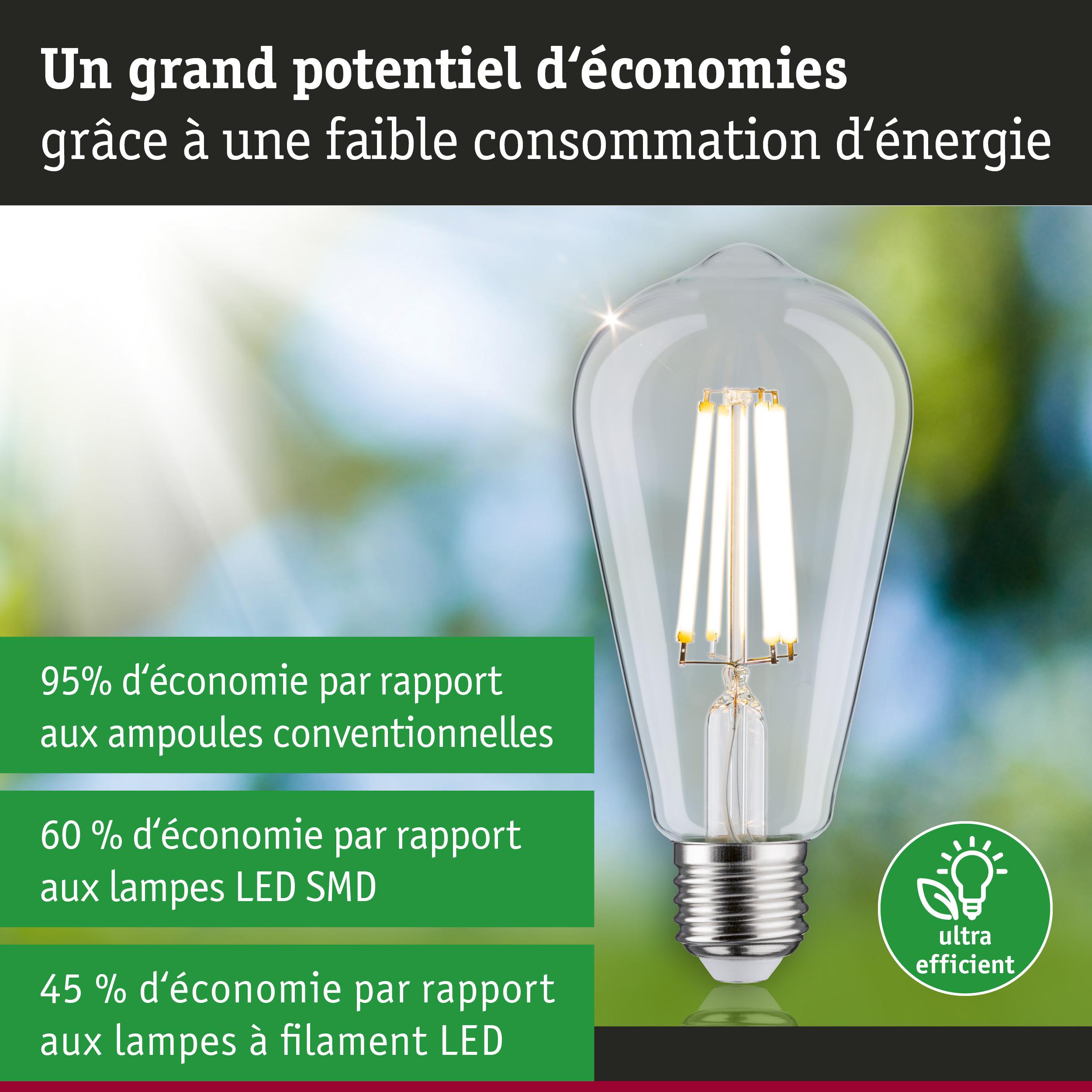 Les ampoules ultra efficaces de l'Eco-Line combinent innovation et durabilité. Grâce à une consommation d'énergie réduite de 60 % et à une durée de vie résolument plus longue que celle des ampoules LED standard, il est possible de réduire considérablement les coûts énergétiques tout en préservant l'environnement. L'ampoule cylindrique à filament claire avec 4000K, une puissance de 4W et 840lm diffuse sa lumière dans toutes les directions sans teinte verdâtre. Les lampes LED confèrent une parfaite ambiance Vintage et, installées dans des suspensions rétro, sont de vraies accroche-regard. Elle produit une température de couleur blanc neutre et se combine avec toutes les douilles conventionnelles E27. Les lampes LED Paulmann portant le label Eye friendly produisent une lumière confortable qui préserve les yeux. Que ce soit pour travailler, lire ou se détendre, les lampes contribuent à un meilleur confort visuel.