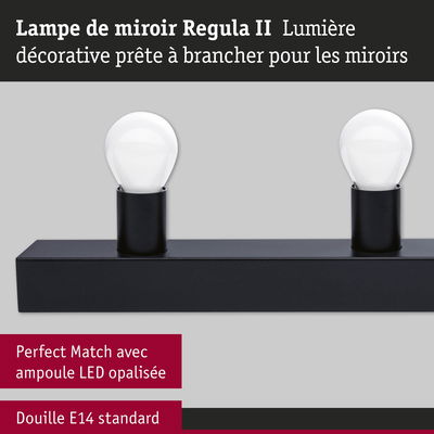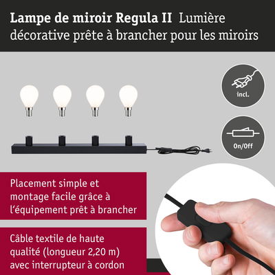 Resplendissant – La solution d'éclairage idéale pour la salle de bains. Ce kit pratique contient la réglette lumineuse Regula II en Noir/Opale, ainsi que les ampoules LED opales adaptées. L’éclairage de miroir à 4 flammes est livré avec un connecteur de câble textile pratique, rendant son installation très facile. Une seule prise de courant est nécessaire, il n'est pas nécessaire de prévoir une sortie de courant au mur. Avec son design moderne et épuré, elle s’intègre harmonieusement dans différents styles d’intérieur et attire l’attention visuellement aussi bien sur la coiffeuse que dans le couloir. La longueur de 60 cm est adaptée aux dimensions standard des miroirs. Sont incluses 4 ampoules LED sphériques en Noir/Opale qui confèrent à l’éclairage de miroir un look à la fois moderne et classique. Avec une puissance de 4x4,5W chacune, elles diffusent une lumière blanc chaud, rayonnante. Vous pouvez régler la luminosité en fonction de vos besoins. L'installation du Regula II est très simple : elle peut être montée sur le mur au-dessus ou à côté du miroir. Il suffit de visser les ampoules LED opales ou d’autres ampoules de votre choix munies d’une douille E14, pour qu’elle soit immédiatement opérationnelle. Plus rien ne s'oppose donc à une ambiance lumineuse agréable dans la salle de bains. Pour nettoyer les luminaires, il est préférable d'utiliser un chiffon doux – évitez d'utiliser un chiffon en microfibre.