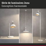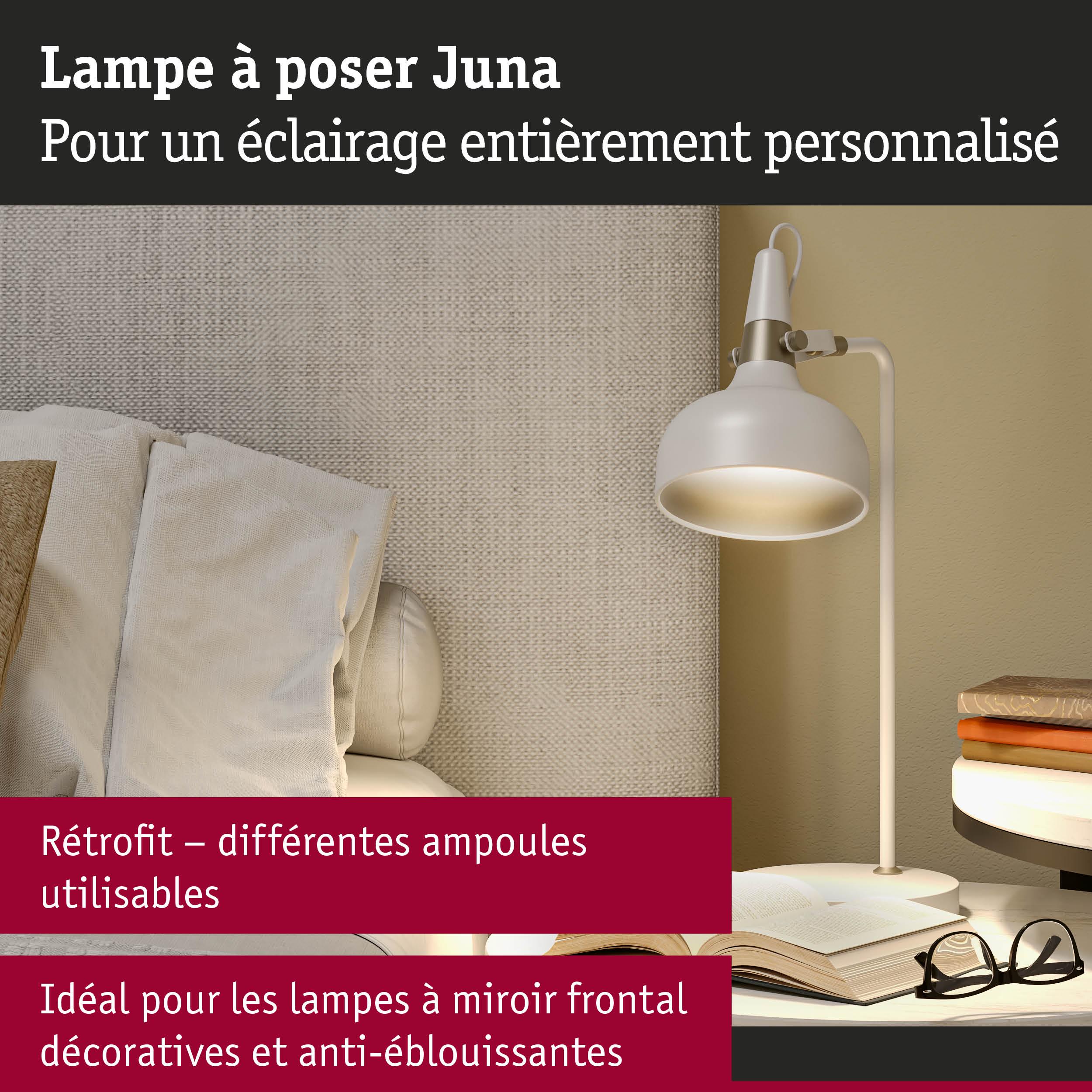 Avec ses formes et son design à la fois intemporels et modernes, la série de luminaires Juna s'adapte aux styles d'intérieur les plus divers tout en apportant des accents lumineux attrayants dans les espaces de vie. Les lampes à poser, lampadaires et suspensions de la série, assortis les uns aux autres, peuvent se combiner harmonieusement à votre guise. La lampe à poser blanc dépoli avec de très beaux accents couleur doré champagne est polyvalente et convient parfaitement sur une table de chevet, comme lampe de bureau ou comme éléments décoratif sur un buffet. Sa finition de haute qualité lui confère non seulement un aspect attrayant, mais aussi une longue durée de vie. La tête mobile du luminaire permet d'orienter la lumière à volonté, tandis que le câble textile de couleur coordonnée garantit une utilisation confortable et sûre. Les ampoules recommandées sont notamment les lampes à calotte argentée décoratives avec culot E14, qui diffusent une lumière non éblouissante.