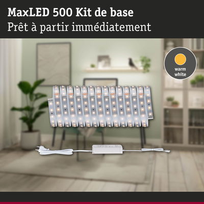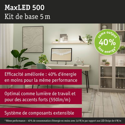 Le kit de base MaxLED 500 blanc chaud est le choix idéal pour une solution d’éclairage moderne et particulièrement efficace en termes d’énergie. Par rapport aux luminaires traditionnels, le Strip LED consomme 40 % d’énergie en moins pour le même rendement lumineux. Le Strip convient parfaitement à l’utilisation dans les profilés et, avec une température de couleur de 2700 K, il fournit une lumière propice au travail agréable et non éblouissante. À tout moment, vous pouvez créer l’ambiance lumineuse souhaitée en atténuant la luminosité de manière flexible. Le Strip est facile à raccourcir à l’aide de ciseaux et il s’adapte ainsi facilement aux conditions propres à votre pièce. Comme le Strip est facile à fixer aux meubles, aux étagères ou aux murs, de nombreuses options de décoration s’offrent à vous. En plus du ruban, le kit de base comprend un ballast électronique adapté. Il est possible, au besoin, d'étendre le système à l'aide d'une unité de commande avec télécommande.
