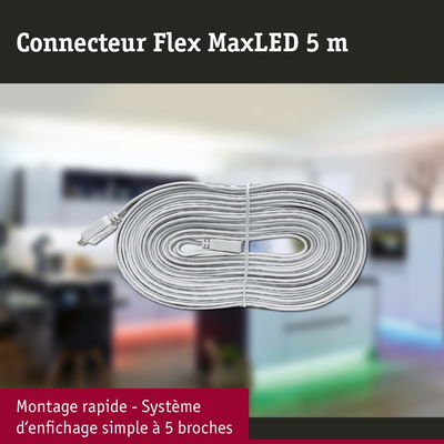 Destiné à l'extension ou au pontage de distances jusqu'à cinq mètres, ce câble de raccordement MaxLED peut être utilisé pour compenser les inégalités. Il convient également à la pose dans les espaces étroits ou à la modification du plan de pose. 5 broches pour 24 V.
