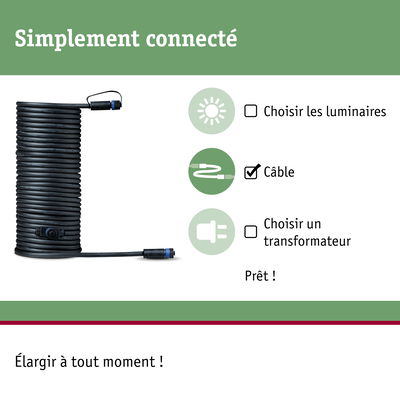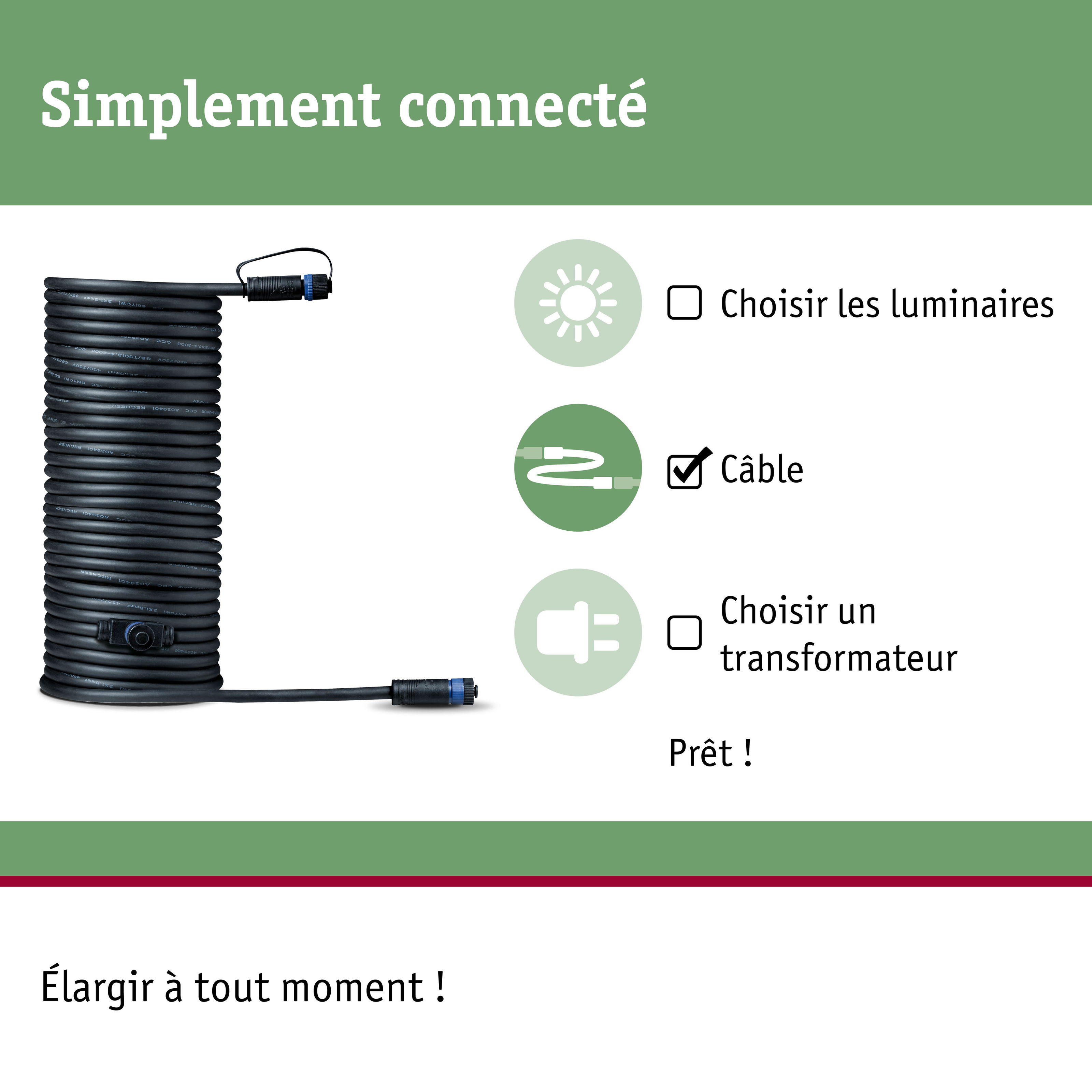 Le câble de raccordement Plug & Shine couvre jusqu'à une distance de dix mètres et permet le raccordement de deux luminaires supplémentaires ou autres accessoires. Vous pouvez fermer les sorties inutilisées avec les caches fournis, afin que vous puissiez garantir la protection contre les projections d'eau IP68. En combinaison avec les luminaires et transfos de la série Plug & Shine, vous pourrez éclairer votre extérieur à votre guise : depuis le mur de la maison jusqu'aux allées du jardin et les plantes, en passant par la terrasse.