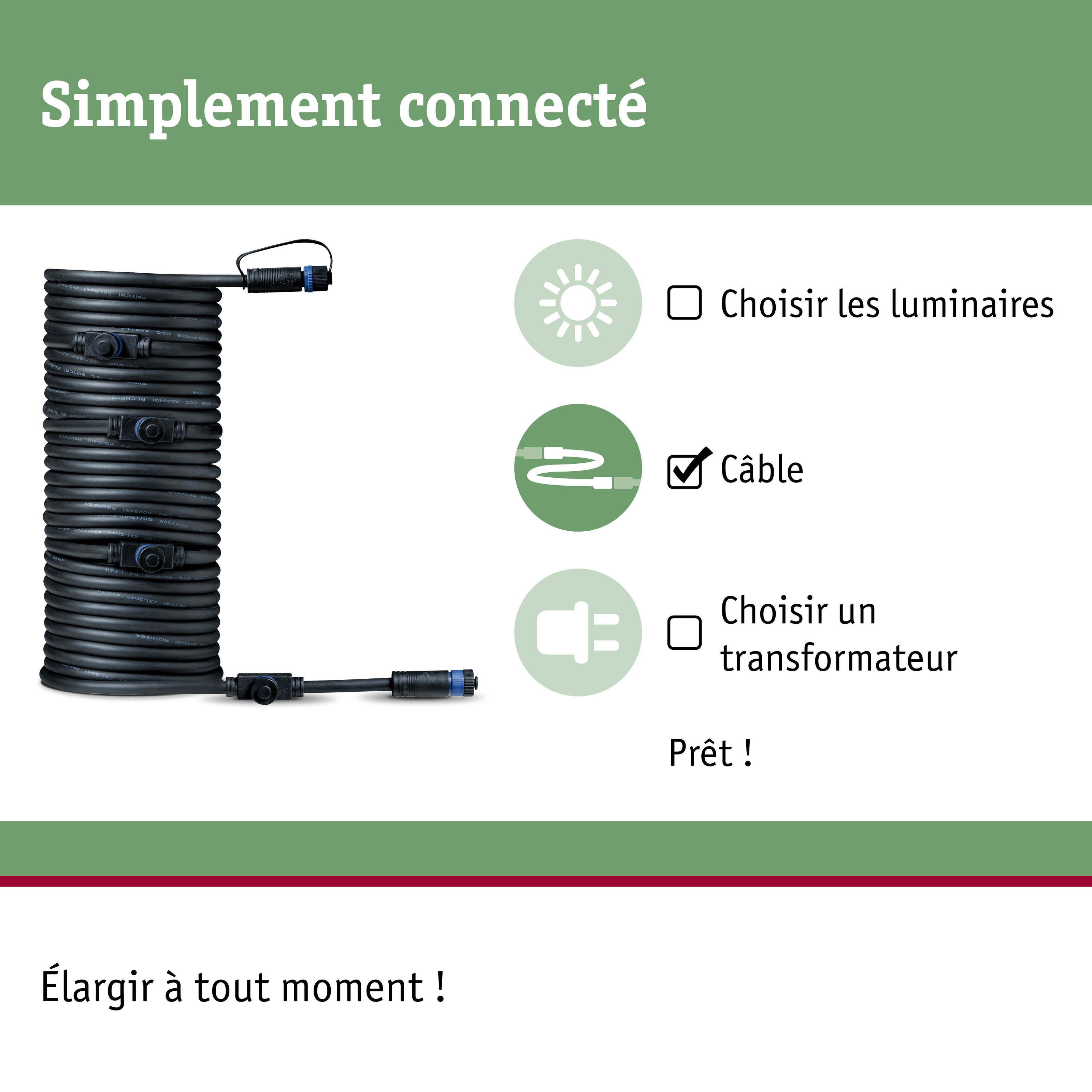 Le câble de raccordement Plug & Shine couvre jusqu'à une distance de dix mètres et permet le raccordement de cinq luminaires supplémentaires ou autres accessoires. Vous pouvez fermer les sorties inutilisées avec les caches fournis, afin que vous puissiez garantir la protection contre les projections d'eau IP68. En combinaison avec les luminaires et transfos de la série Plug & Shine, vous pourrez éclairer votre extérieur à votre guise : depuis le mur de la maison jusqu'aux allées du jardin et les plantes, en passant par la terrasse.