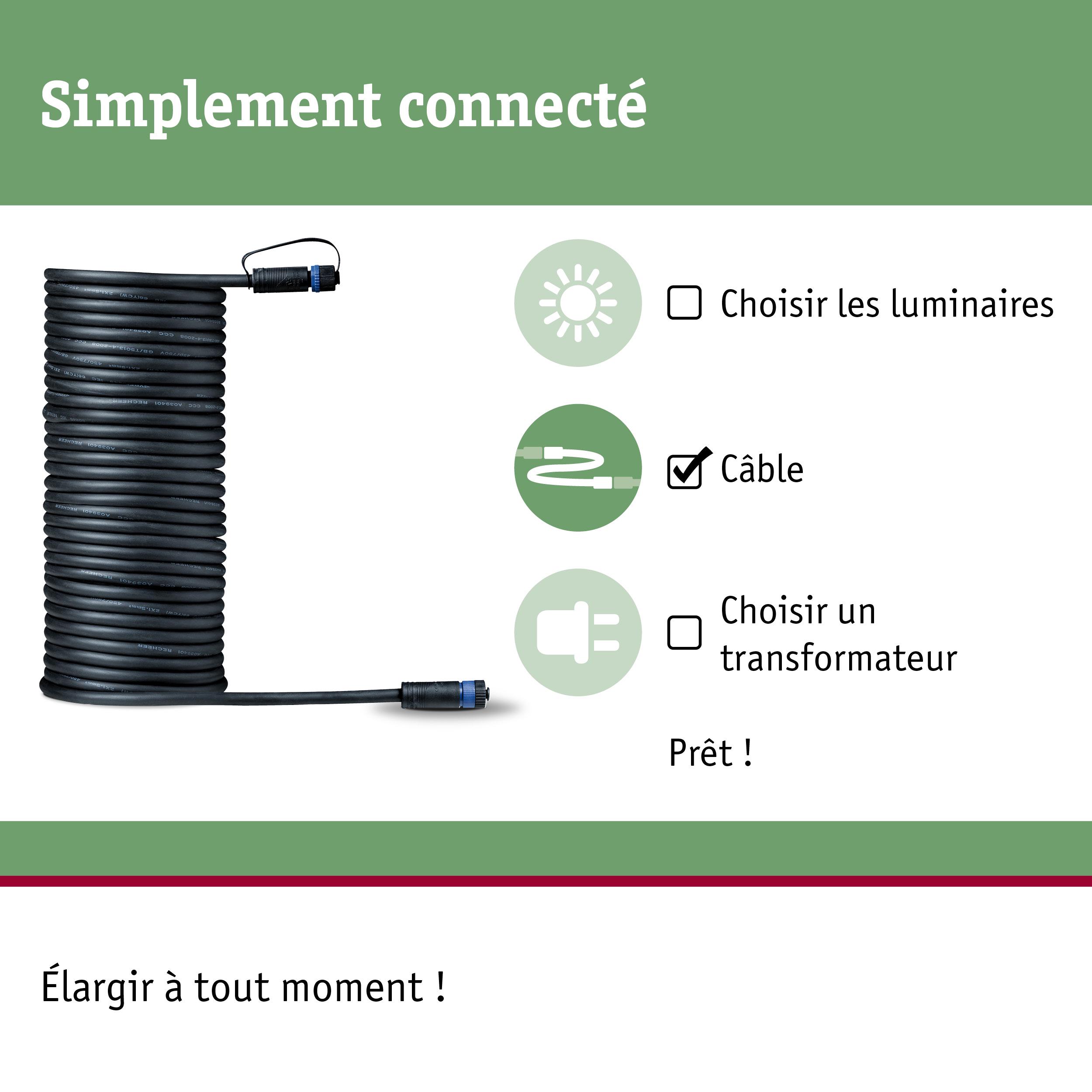Le câble de raccordement Plug&Shine couvre jusqu'à une distance de dix mètres et permet le raccordement d'un luminaire ou d'un câble supplémentaire. En combinaison avec les luminaires et transfos de la série Plug&Shine, vous pourrez éclairer votre extérieur à votre guise : depuis le mur de la maison jusqu'aux allées du jardin et les plantes, en passant par la terrasse.